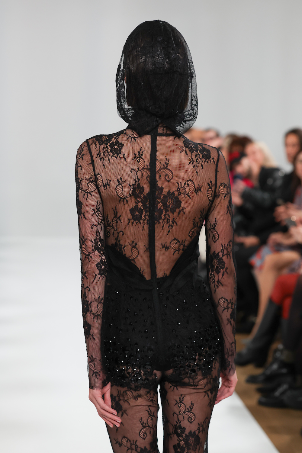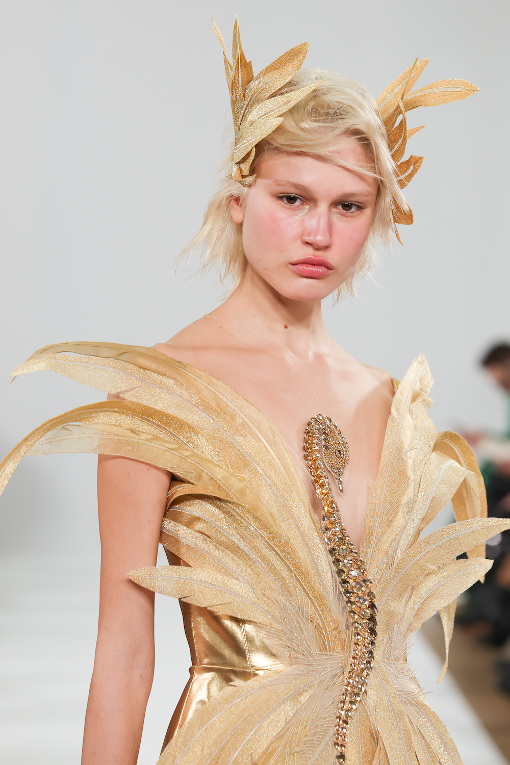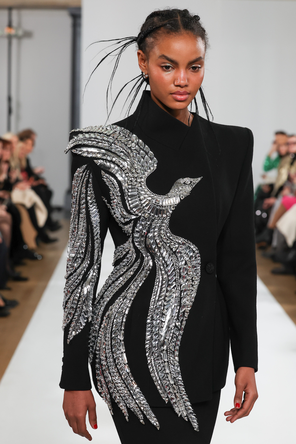 Тонкое кружево призвано усилить провокацию образов, сделать их более женственными и легкими. На контрасте строгие черные приталенные костюмы с акцентной линией плеч созданы для собранных power woman. Обтягивающий черный комбинезон эпатирует ультра — короткой длиной. Птица Феникс пролетает через всю коллекцию, сияя серебром на жакетах, золотом на платьях, взмахивая крыльями и взлетая на струящихся юбках-колоколах. Завершают коллекцию эффектные платья с уникальной мантией с оперением, представленной в 3х разных вариантах.