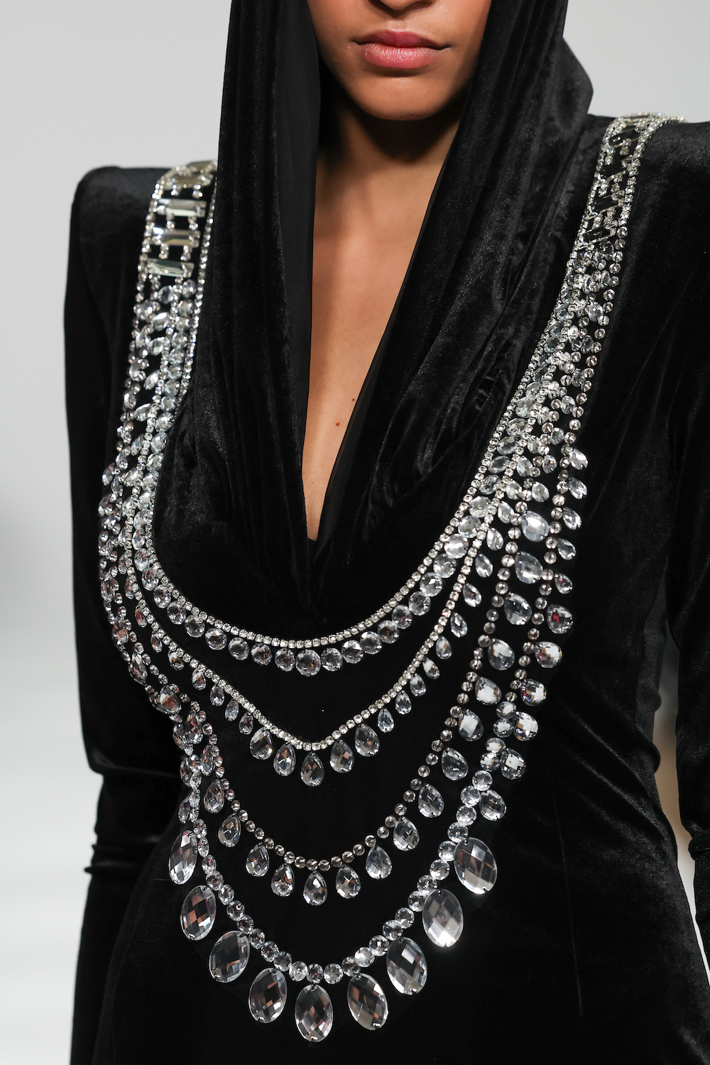 В коллекции используются традиционные для дома материалы: бархат, сетка, романтичный шифон и органза в сопровождении объемных элементов и филигранной ручной вышивки от мастеров дома. Силуэты вдохновлены плавными линиями женского тела. В палитре преобладает черный, но важное место отведено также золоту, графиту, белому, а разбавляет цветовую гамму небольшой яркий штрих — фуксия. Специально для этой коллекции разработаны новые технологии вышивки перьев, они вышиты в разных современных техниках.