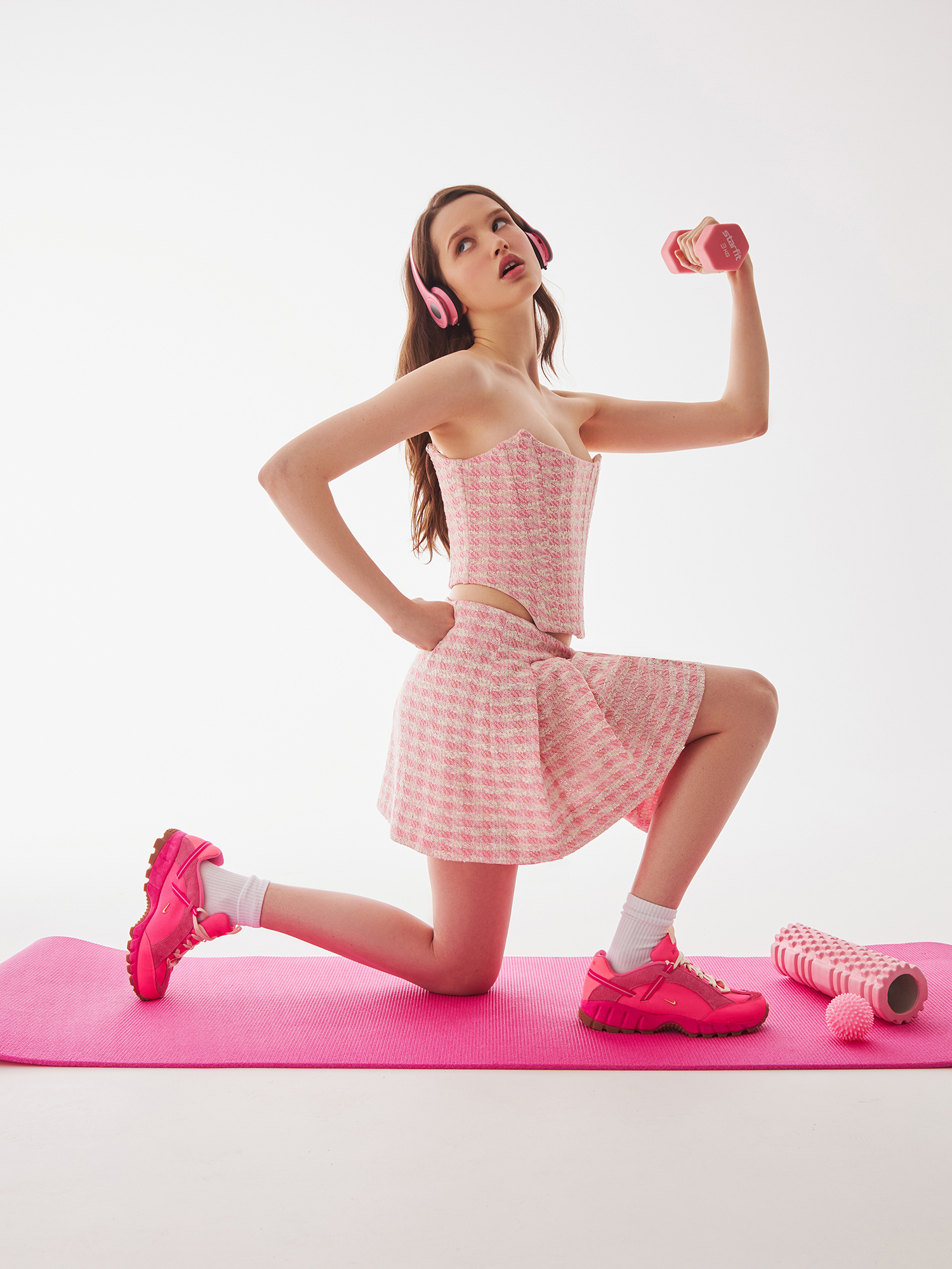 Классические силуэты и фактуры контрастируют с беззаботным кокетливым вайбом розового цвета. Гусиная лапка, твид, банты и стразы – вся коллекция дышит весенним настроением. Ключевая вещь дропа – пальто из твида, выпущенное в розовом и черном варианте. Корсет с бантами в стиле Марии-Антуанетты можно сочетать с джинсами с вышивкой из страз. Классический деним ALINE в этом сезоне выпущен в формате прямых джинсов со вшитой резинкой из органзы.