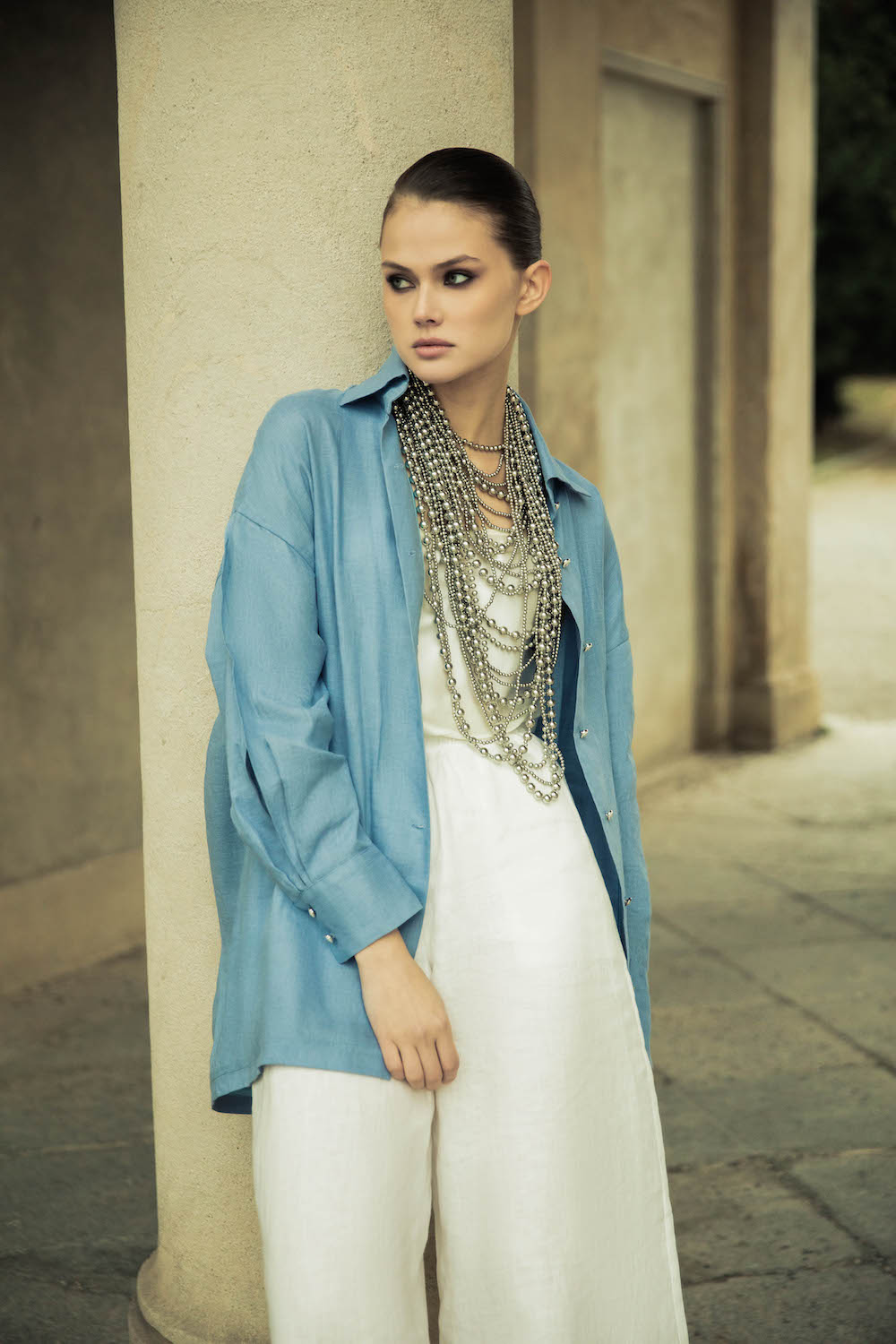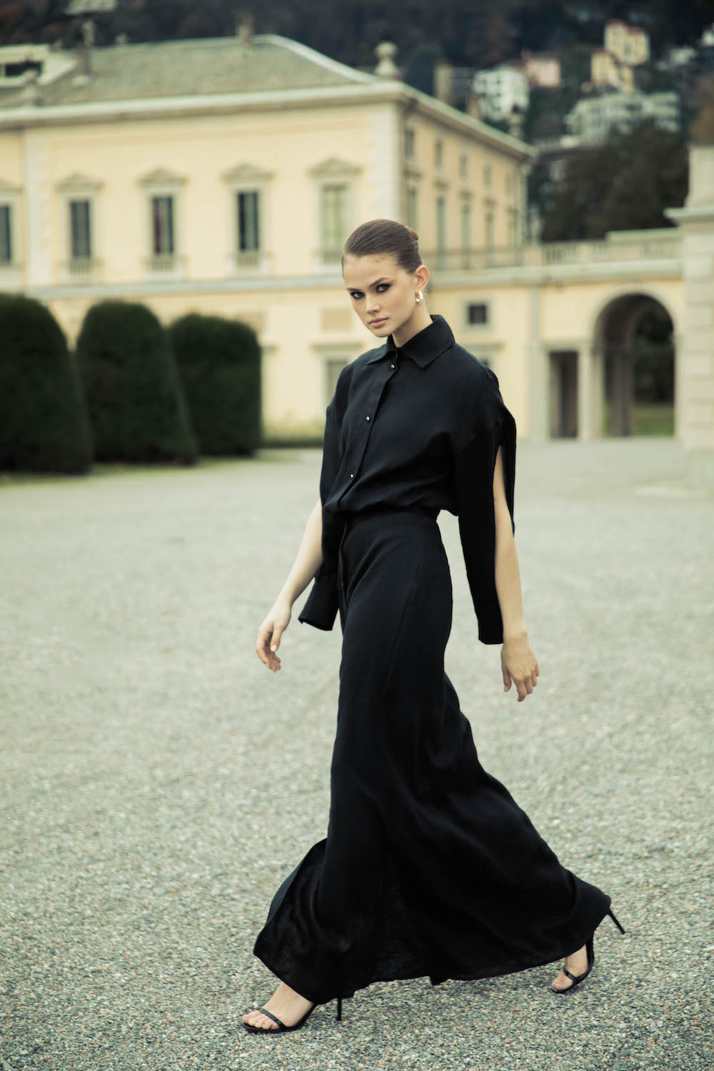Атмосферная съемка  лукбука прошла в Италии, на озере Комо. В основе коллекции  лежит идея комфортных образов на лето, где важное  место отведено качественным тканям и легкой посадке, не сковывающей движений.  Платья с запахом и платья-футляры, свободные  брюки на резинке, кюлоты, длинные рубашки в люксовом исполнении .  Бренд традиционно использует только дорогие ткани, в частности итальянский лен, шелк. Хит коллекции – нежно – розовое элегантное миди- платье из шелковой вискозы, которое подчеркивает хрупкий силуэт. Черное платье с юбкой годе  — must – have для летнего коктейля. Интересная деталь в коллекции – разрезы  на рукавах рубашек.