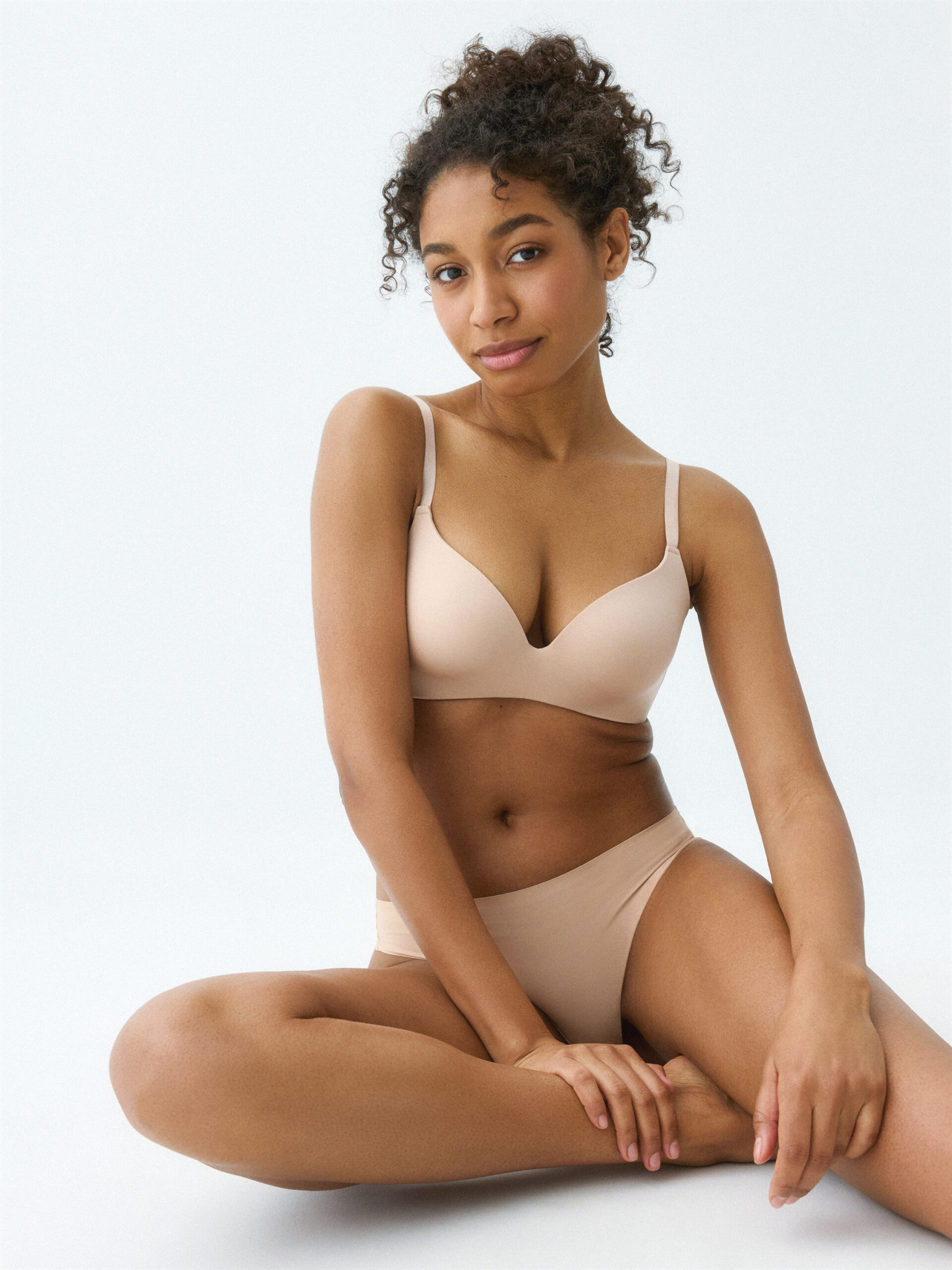 В женской линейке underwear бренд впервые выпустил формованное нижнее белье. Бюстгалтер выполнен из гладкой микрофибры, со слегка уплотненными чашками без косточек — в нем комфортно на протяжении всего дня. Невидимый внутренний каркас позволяет этой модели хорошо поддерживать грудь. В комплект можно выбрать базовые трусы из такой же гладкой микрофибры, либо из хлопка. Формованное нижнее белье представлено в двух универсальных оттенках — бежевый и черный.