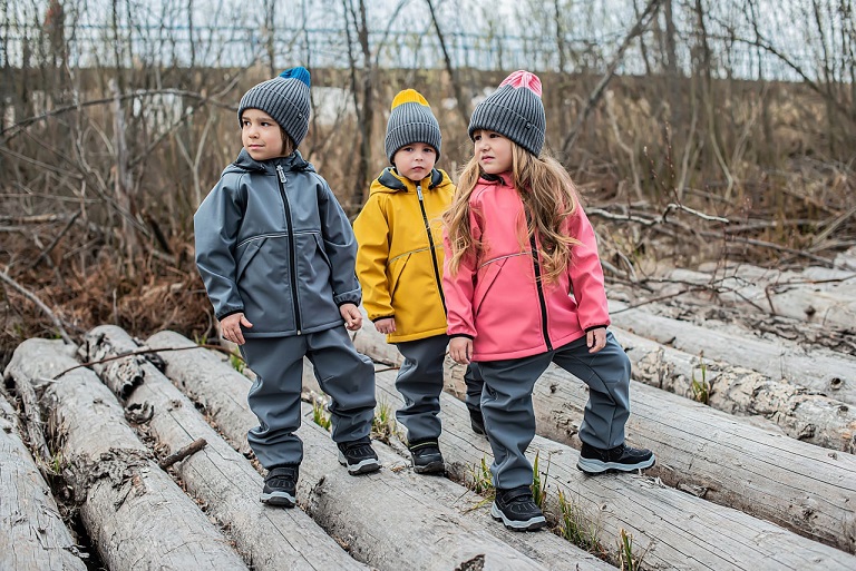 Верхняя одежда шьется из современного высокотехнологичного материала софтшелл. Комбинезоны, куртки и штаны из этой трехслойной ткани легкие и устойчивы к действию влаги, ветра и низких температур. Одежду из софтшелла можно надевать ранней осенью прямо поверх леггинсов и футболки, а ближе к зиме и первым заморозкам — с утепленным комбинезоном или термобельем и флисом.