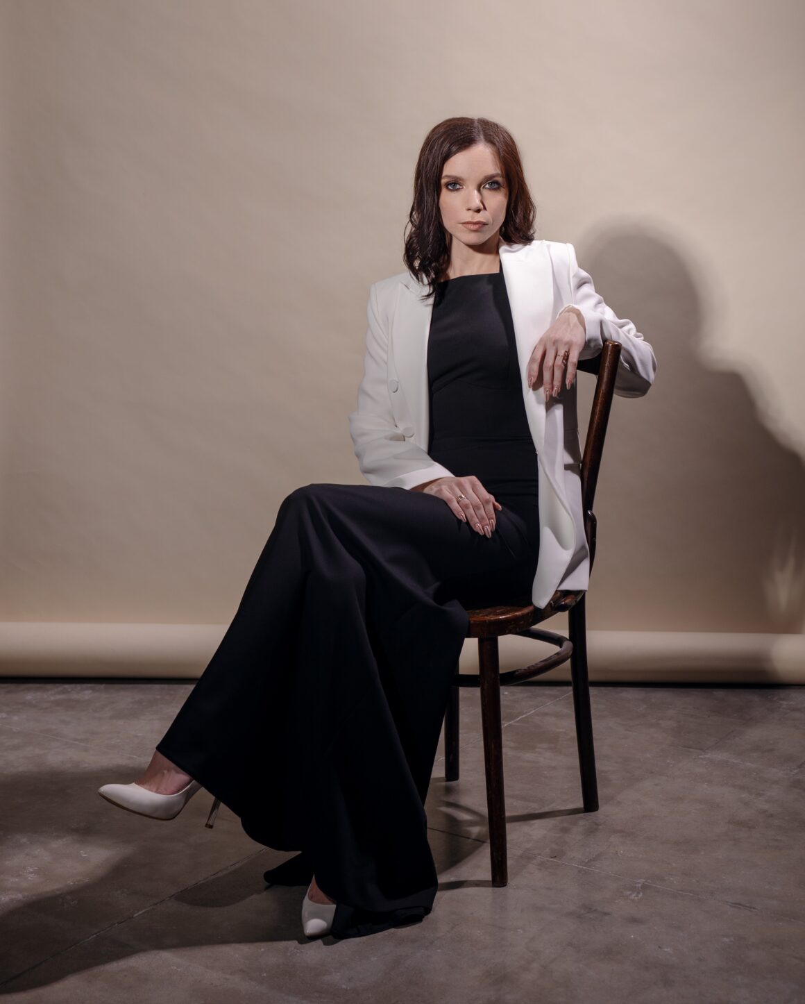 В своей первой коллекции я создала два романтичных, женственных платья, которые могут роскошно смотреться как на мероприятиях, так и на свадебной церемонии где-нибудь на островах, и одно более сдержанное платье-пиджак из шифона. Сочетание темного графита и желто-коричневой клетки- особенность этого изделия. Такой симбиоз рождает элегантный характер, с подчеркнутой британской строгостью.