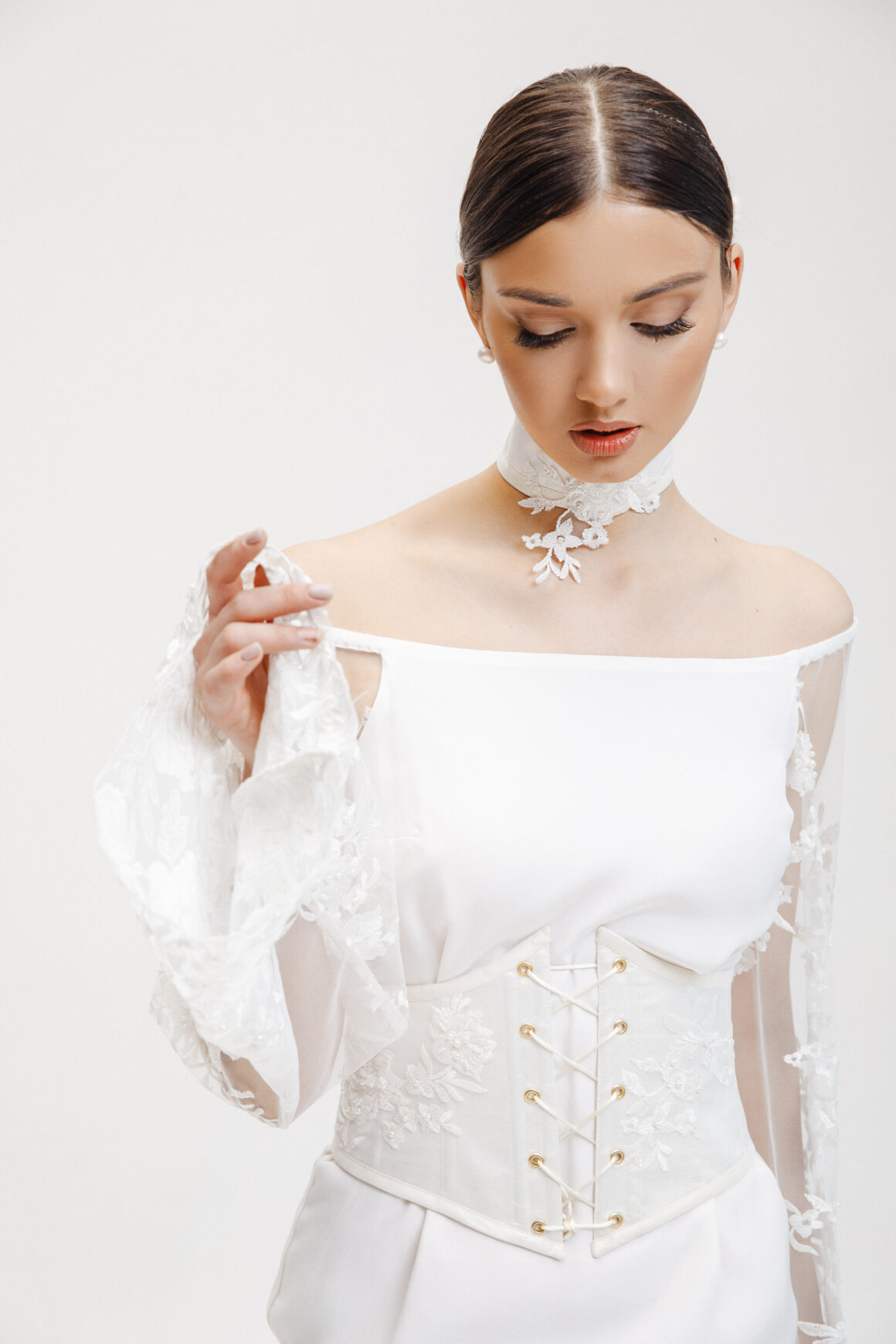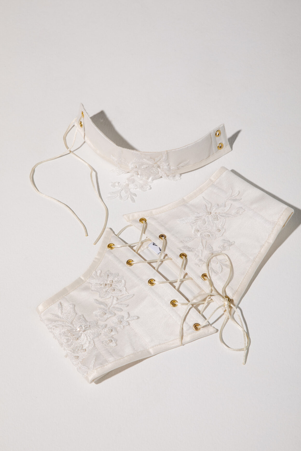 К каждому платью в коллекции создан пояс- корсет. 2 корсета из 100% шелка с хлопковой подкладкой и для платья- пиджака подгрудный корсет из неэластичной сетки».