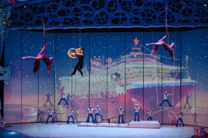 «Новогодний круиз» — уникальный мюзикл на воде, не имеющий аналогов в мире. В шоу участвуют морские животные, воздушные гимнасты, акробаты, жонглеры, певцы, танцоры и синхронистки. На головокружительной высоте над водной чашей канатоходец — рекордсмен книги Гиннеса заставляет замирать сердца зрителей, а всё представление сопровождает живая музыка в исполнении музыкальной группы. Гостей нового сезона шоу ждут потрясающие спецэффекты, а также новые элементы программы: кинетическая и лазерная инсталляции, новый цирковой номер на воздушных полотнах. Главными звездами шоу являются дельфины, морские львы, морж и косатки, которые предстают в необычном амплуа. Морские животные также порадуют зрителей новыми элементами в программе своих выступлений.