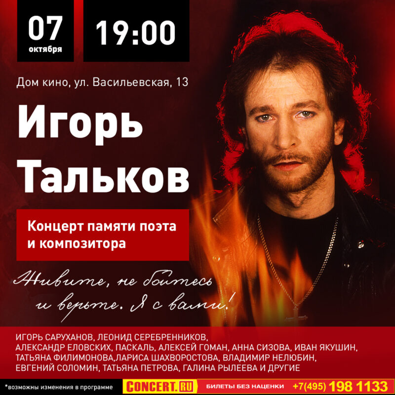 7 октября 2021 года в Доме кино в Москве пройдет концерт памяти поэта и композитора Игоря Талькова «Живите, не бойтесь и верьте. Я с вами!».