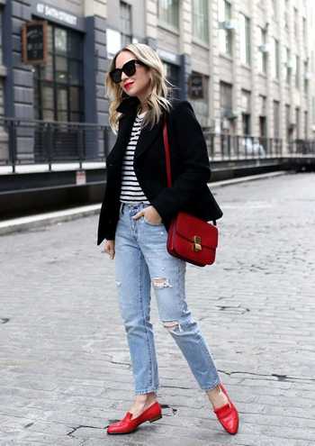 Что касается обуви, рекомендуем сделать в этом сезоне ставку на удобство. Красивая и элегантная альтернатива, порядком поднадоевшим всем кроссовкам. Лоферы с квадратным носом- особый фаворит модниц и дизайнеров, обещающих много подобной обуви на осенних показах. В жаркие дни можно носить на босую ногу, а на более прохладную погоду надевать вниз блестящие носки.