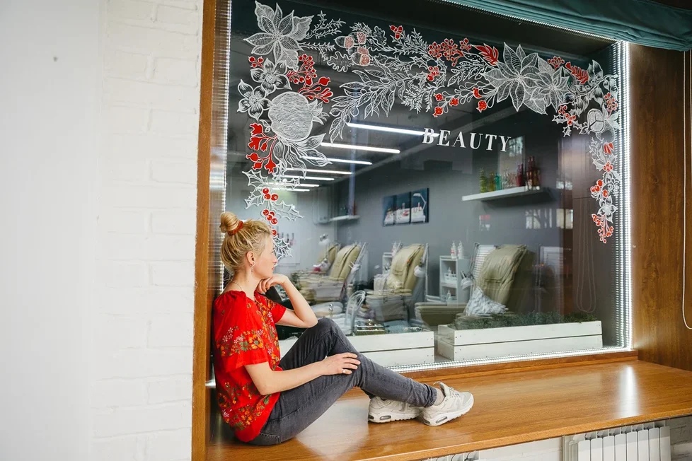 Сеть салонов «Пальчики» славится своим гостеприимством, и новое оформление окон теперь его подтверждает: в растительном орнаменте красуется омела, святое растение, символизирующее любовь к гостям, плодородие и праздник. Также в зимний букет художница добавила вечнозеленое растение пуансеттию (рождественская звезда), эвкалипт, гранат (греческий символ зимних торжеств), морозник (цветок, ставший подарком младенцу Христу), дуб, тисовое дерево и остролист, который еще древние кельты использовали в венках для празднования Йоля — дня зимнего солнцестояния.