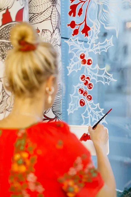 Сеть салонов «Пальчики» славится своим гостеприимством, и новое оформление окон теперь его подтверждает: в растительном орнаменте красуется омела, святое растение, символизирующее любовь к гостям, плодородие и праздник. Также в зимний букет художница добавила вечнозеленое растение пуансеттию (рождественская звезда), эвкалипт, гранат (греческий символ зимних торжеств), морозник (цветок, ставший подарком младенцу Христу), дуб, тисовое дерево и остролист, который еще древние кельты использовали в венках для празднования Йоля — дня зимнего солнцестояния.