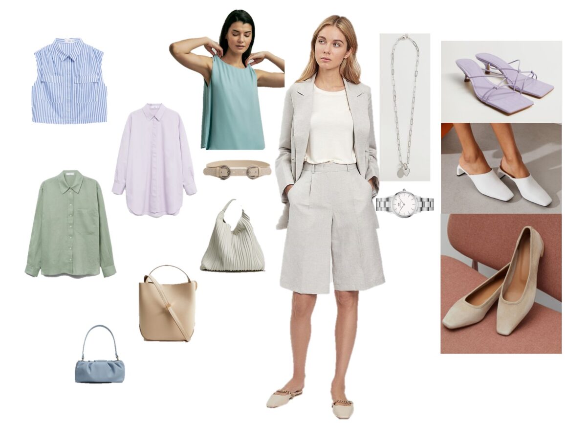 Образы с шортами универсальны: их можно носить в офис при нестрогом дресс-коде, а также на прогулку, в кафе, парк, гости. В зависимости от мероприятия, сочетайте с любой актуальной обувью: подойдут кроссовки, мюли, «дедушкины» сандалии, плетеная обувь, лодочки, лоферы, босоножки. В качестве базы выбирайте классические шорты-бермуды в нейтральных оттенках: светло-серый, бежевый, белый, молочный. Дополните их цветными рубашками, топами, футболками. Не забудьте о сумке, украшениях, ремне. В итоге у вас получится целая мини-капсула.