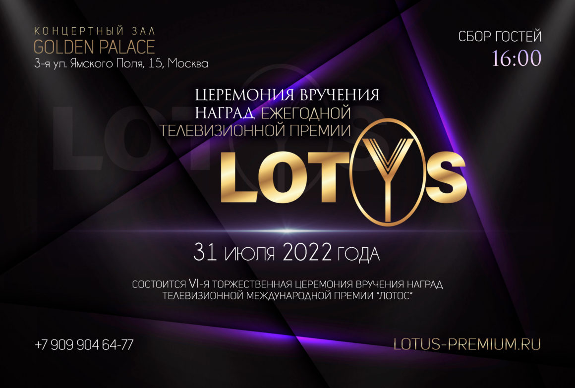 31 июля 2022 года, состоится Торжественная Церемония Вручения Наград Телевизионной Международной Премии Лотос в одном из лучших концертных залов Москвы «Golden Palace», 3-я ул. Ямского Поля, 15.