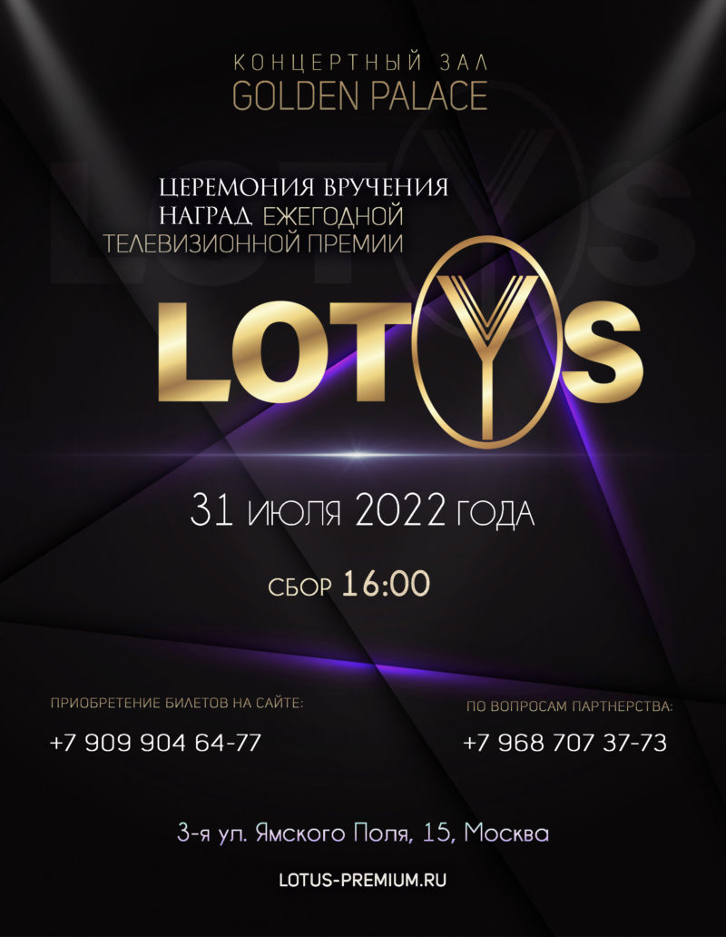 31 июля 2022 года, состоится Торжественная Церемония Вручения Наград Телевизионной Международной Премии Лотос в одном из лучших концертных залов Москвы «Golden Palace», 3-я ул. Ямского Поля, 15.