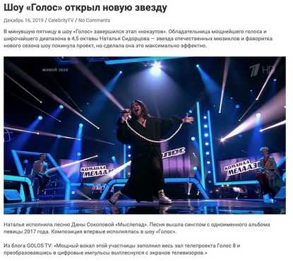 Из блога GOLOS TV: «Мощный вокал этой участницы заполнил весь зал телепроекта Голос 8 и преобразовавшись в цифровые импульсы выплеснулся с экранов телевизоров.»