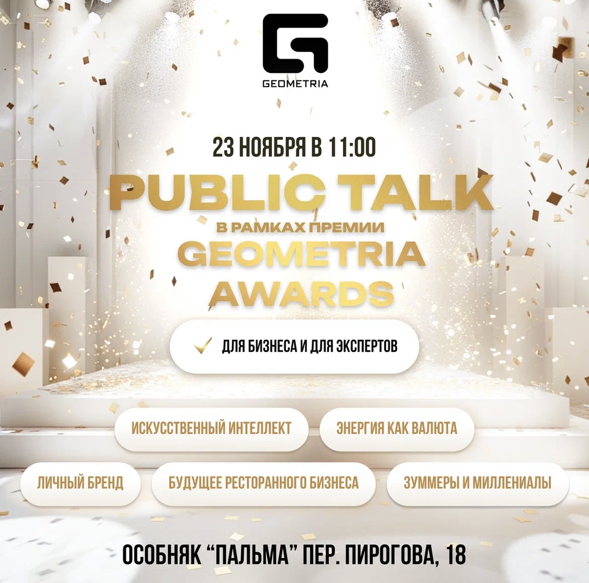 23 ноября в стенах исторического особняка «ПАЛЬМА» состоится церемония награждения Ежегодной премии GEOMETRIA AWARDS SAINT PETERSBURG.