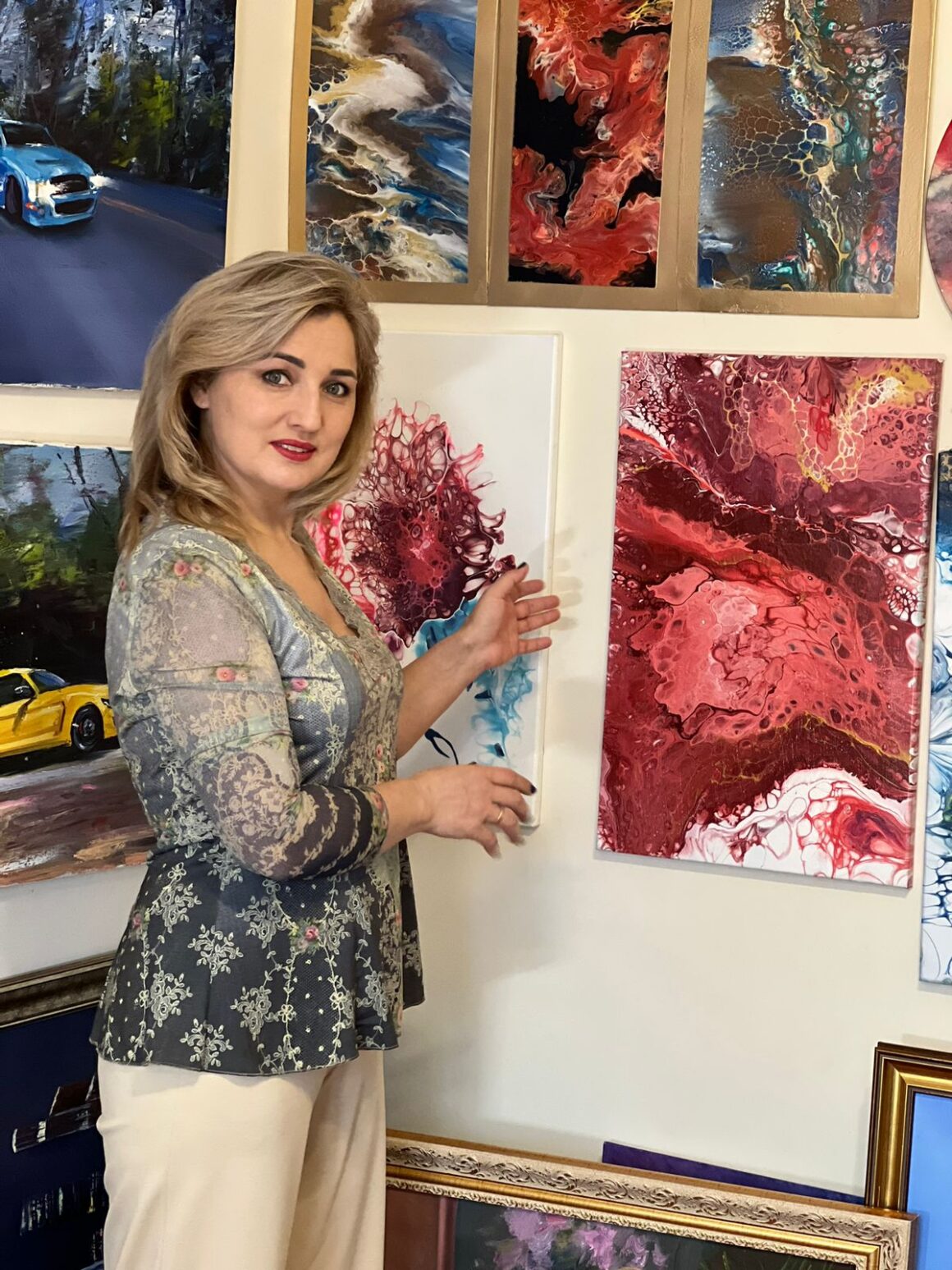 В последние полгода я также обратилась к новым техникам — rasin art  и fluid art. Лирические абстракции чаще всего я создаю по мотивам литературных произведений, например, несколько серий посвящены романам Э. М. Ремарка. Жидкий акрил прекрасно передает эмоции, выраженные в текстах этого великолепного автора, так родилась одна из последних картин — «Маковые поля». Работы смолой отлично создают 3D эффект, дают возможность активно использовать трафареты, но в сравнении с маслом или акрилом носят более декоративный характер, примером чего можно назвать тондо «Античность».