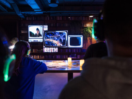 В проекционном зале «Внутришоу» вы в прямом смысле оказываетесь внутри шоу. Пол и стены буквально погружают вас в контент, а музыканты находятся рядом с вами на протяжении всего представления.