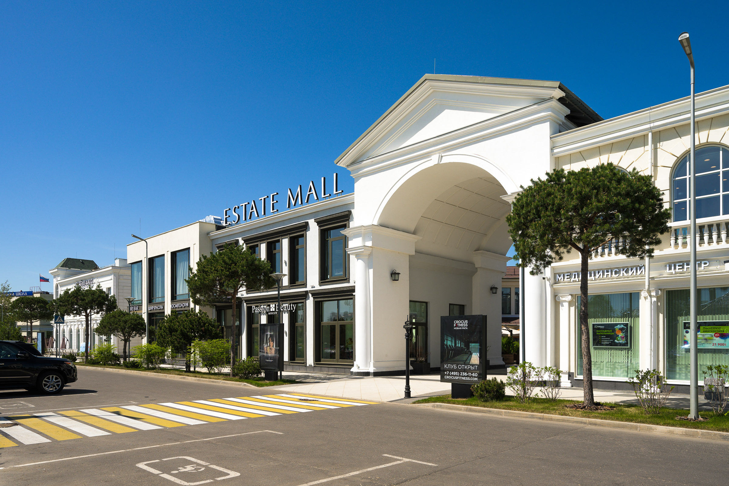 Estate Mall – премиальное торгово-сервисное пространство Состоит из 13 зданий в 1-3 этажа. У каждого строения индивидуальная архитектура и функциональное наполнение. На территории объединены: торговый центр, гастрономические проекты, аптека, рестораны и кафе, большой фитнес-центр сети Crocus Fitness.