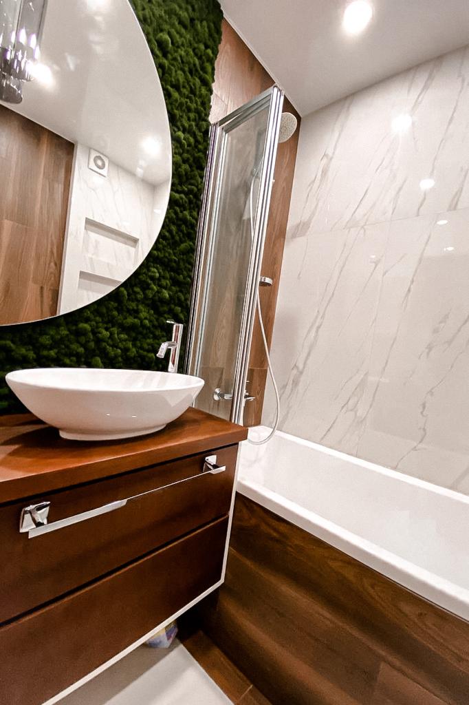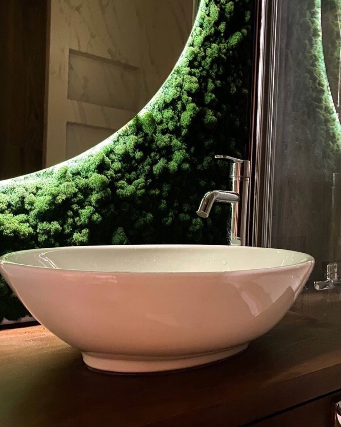 Создание эко-пространства с элементами минимализма,  где мох стал изюминкой, придавая особую уютную атмосферу. Для расширения пространства мы использовали зеркало в форме полумесяца, что позволило совместить сразу несколько задач.