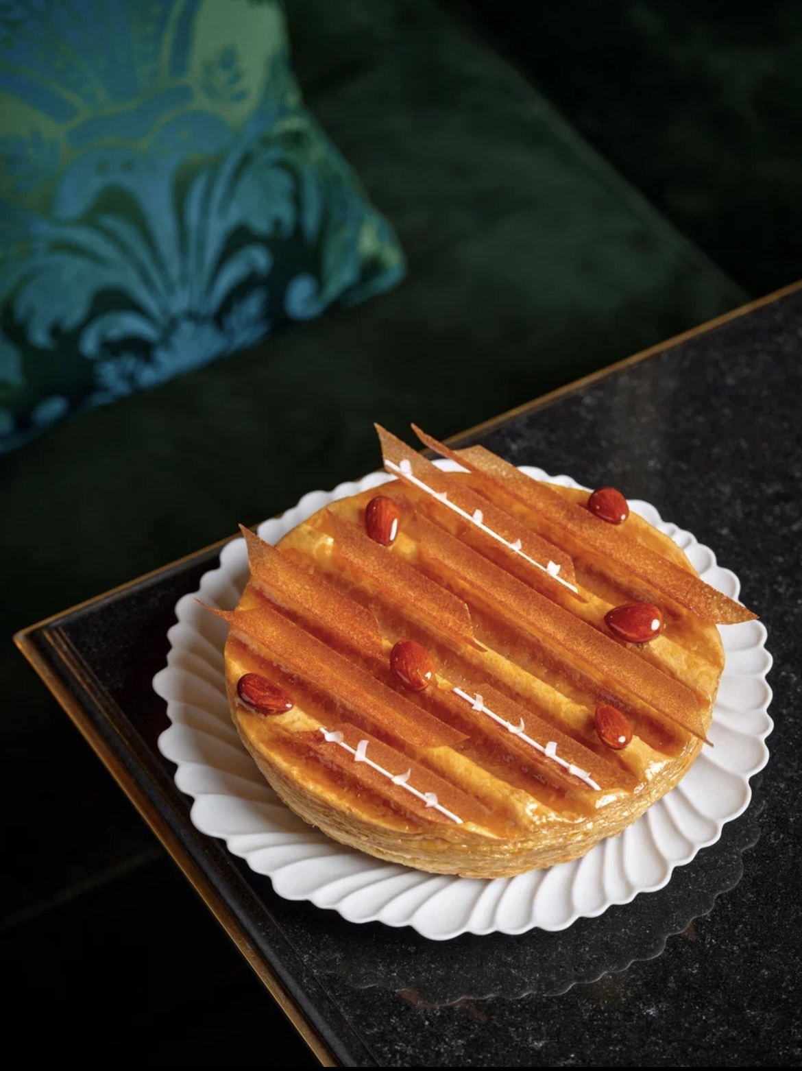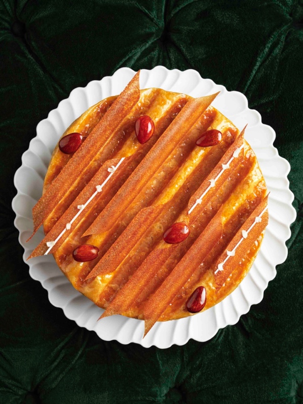 У пирога из слоеного теста начинка из крема сфранжипаном с нежным ароматом флердоранжа и мексиканской ванили, а сверху он украшен элегантными волнистыми линиями и посыпанкарамелизированным валенсийским миндалем и хрустящими печеньем «гавот» с тающей во рту текстурой.
