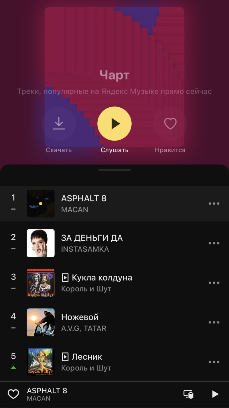 Сейчас в Чарте Яндекс Музыки сразу несколько песен MACAN: «ASPHALT 8», «Пополам» и «Кино».