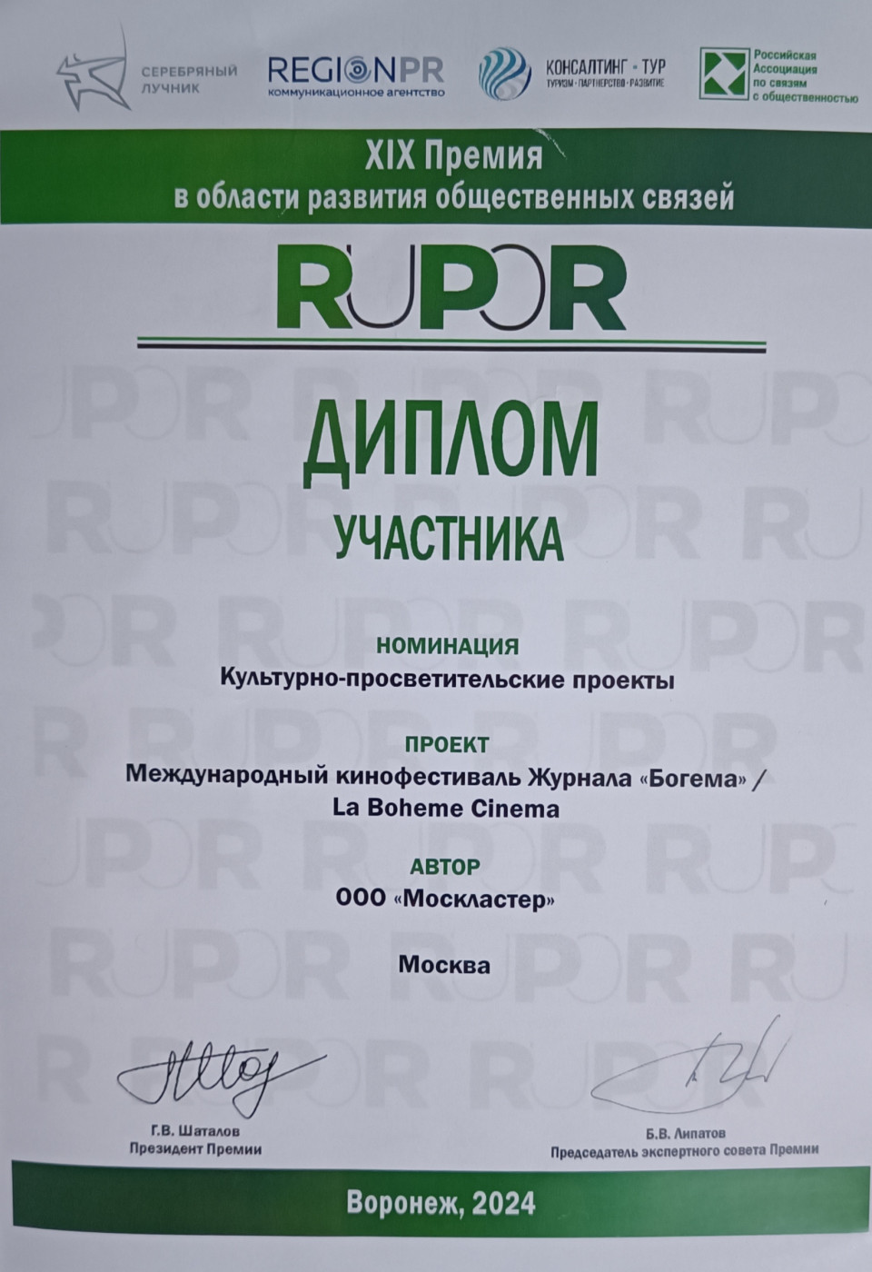 2-3 февраля 2024 г. в Воронеже состоялся финал XIX PR-премии RuPoR, в рамках которого прошли открытые презентации участников, вошедших в шорт-лист, а также торжественная церемония награждения лауреатов. По итогам экспертной оценки в двух этапах премии (дистанционном и очном) лауреатами стали 47 проектов из Москвы, Воронежской, Липецкой, Белгородской, Орловской, Тверской и Ярославской областей. Всего на соискание XIX премии в области развития общественных связей RuPoR было подано 118 заявок из 12 регионов. В шорт-лист экспертами премии отобрано 77 проектов, из которых авторы 64 смогли очно выступить в финале в Воронеже. Международный кинофестиваль Журнала «Богема» или La Boheme Cinema вошел в шорт-лист XIX премии в области развития общественных связей RuPoR в номинации «Культурно-просветительские проекты».