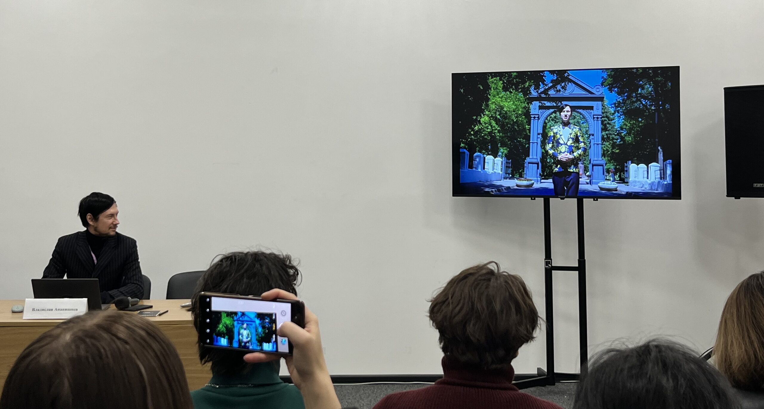 Премьера фильма «История бренда Vladislav Ananishnev» на международной выставке Fashion Style Russia 2024 в Международном выставочном центре «Крокус Экспо». На экране фрагмент, снятый в Московском государственном объединенном музее-заповеднике «Коломенское — Измайлово». Фото: Журнал «Богема», Москва, 20.02.2024 г.