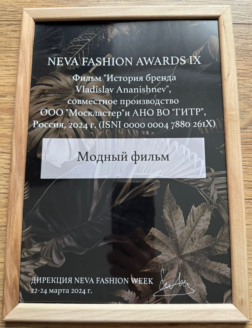 Диплом лауреата в номинации «Модный фильм» Премии Neva Fashion Awards IX Недели моды Neva Fashion Week 2024. Фото: Neva Fashion Week, г. Санкт-Петербург, 03.2024 г.