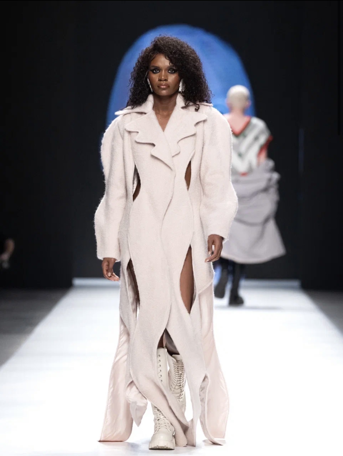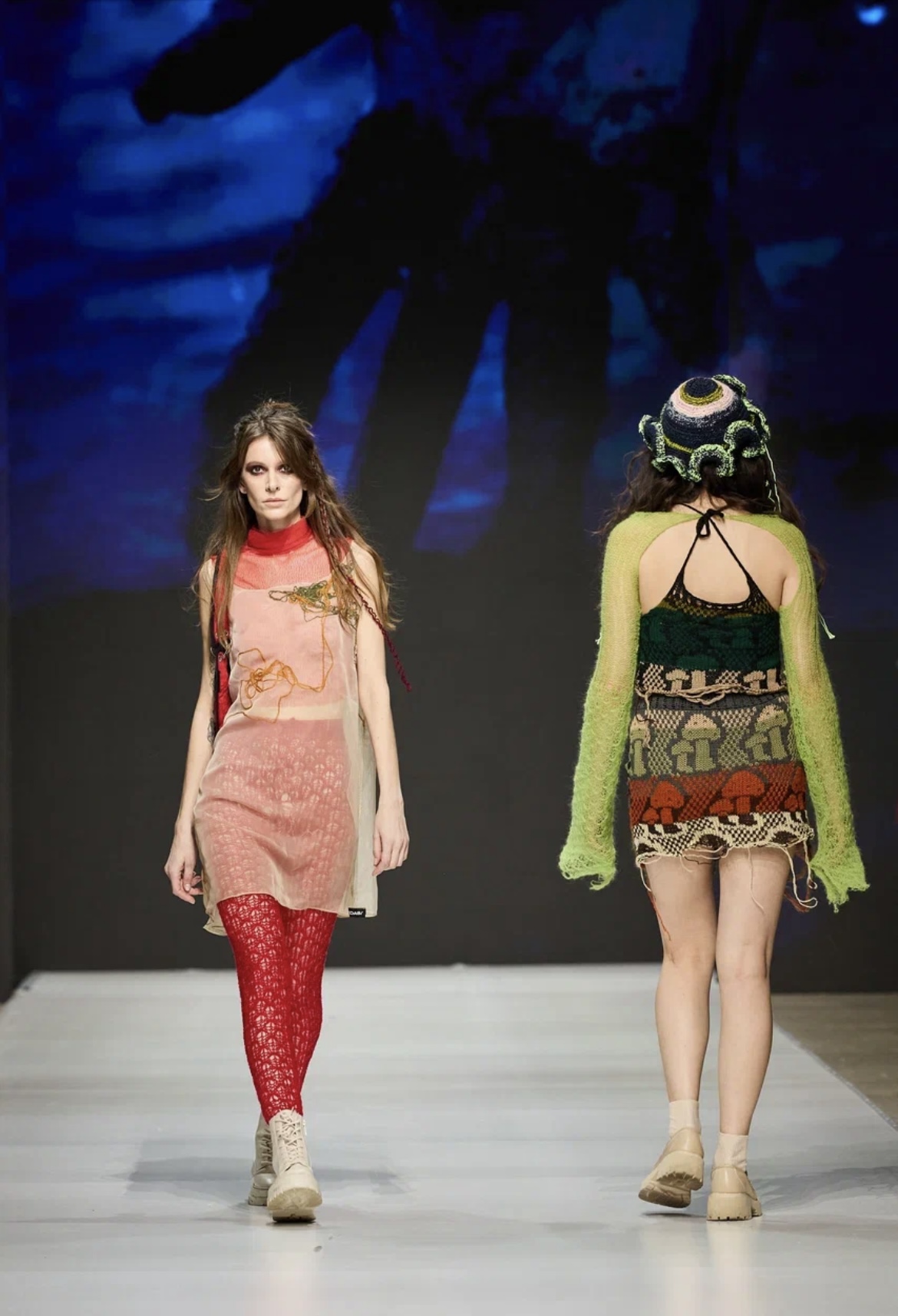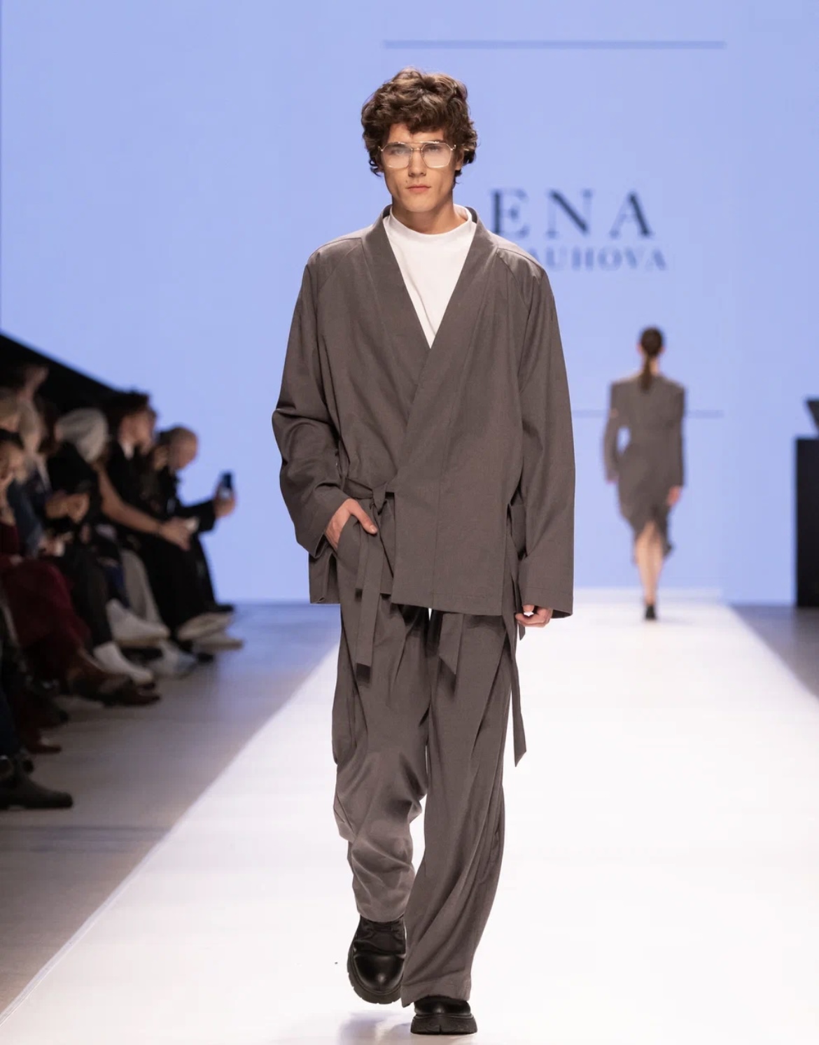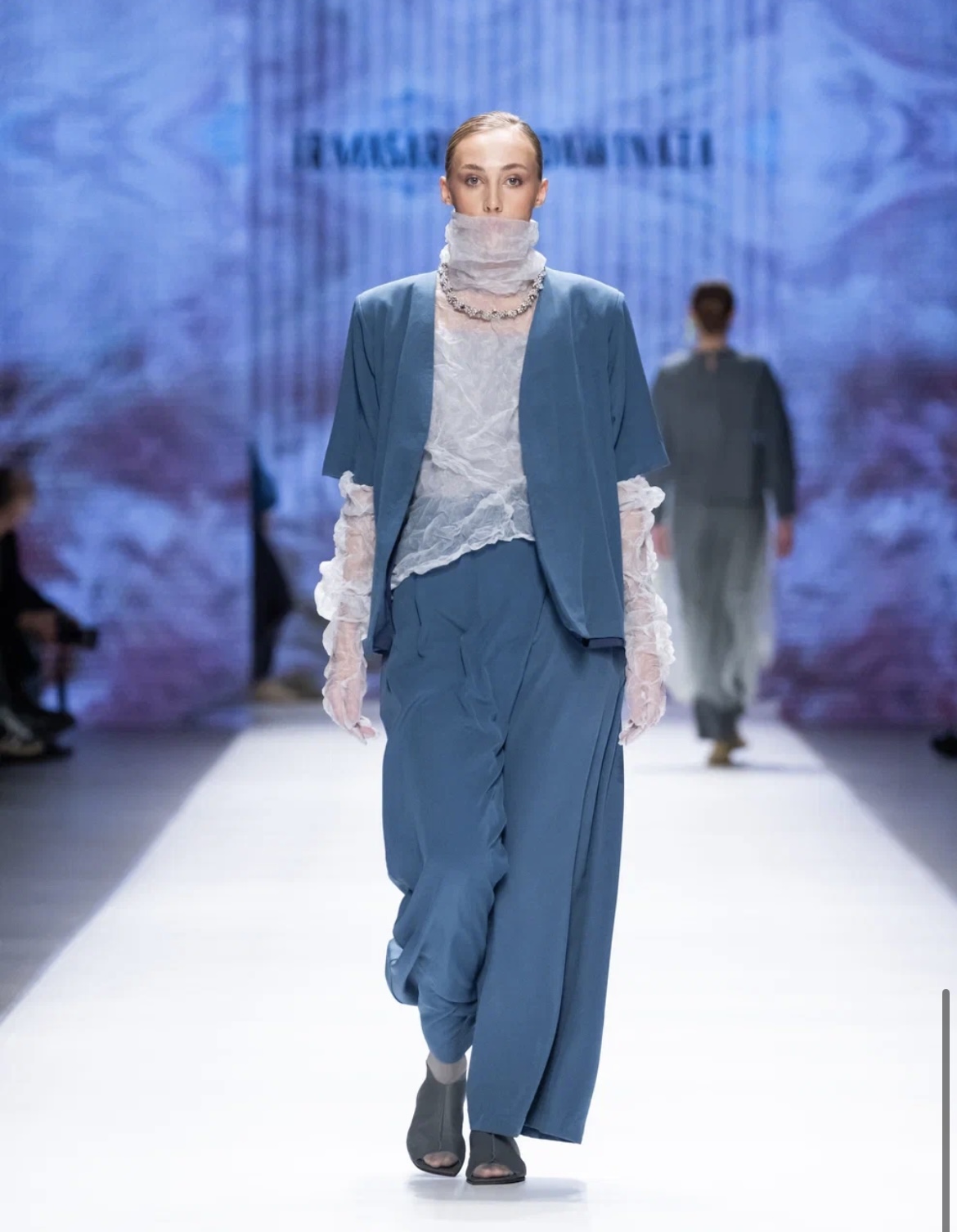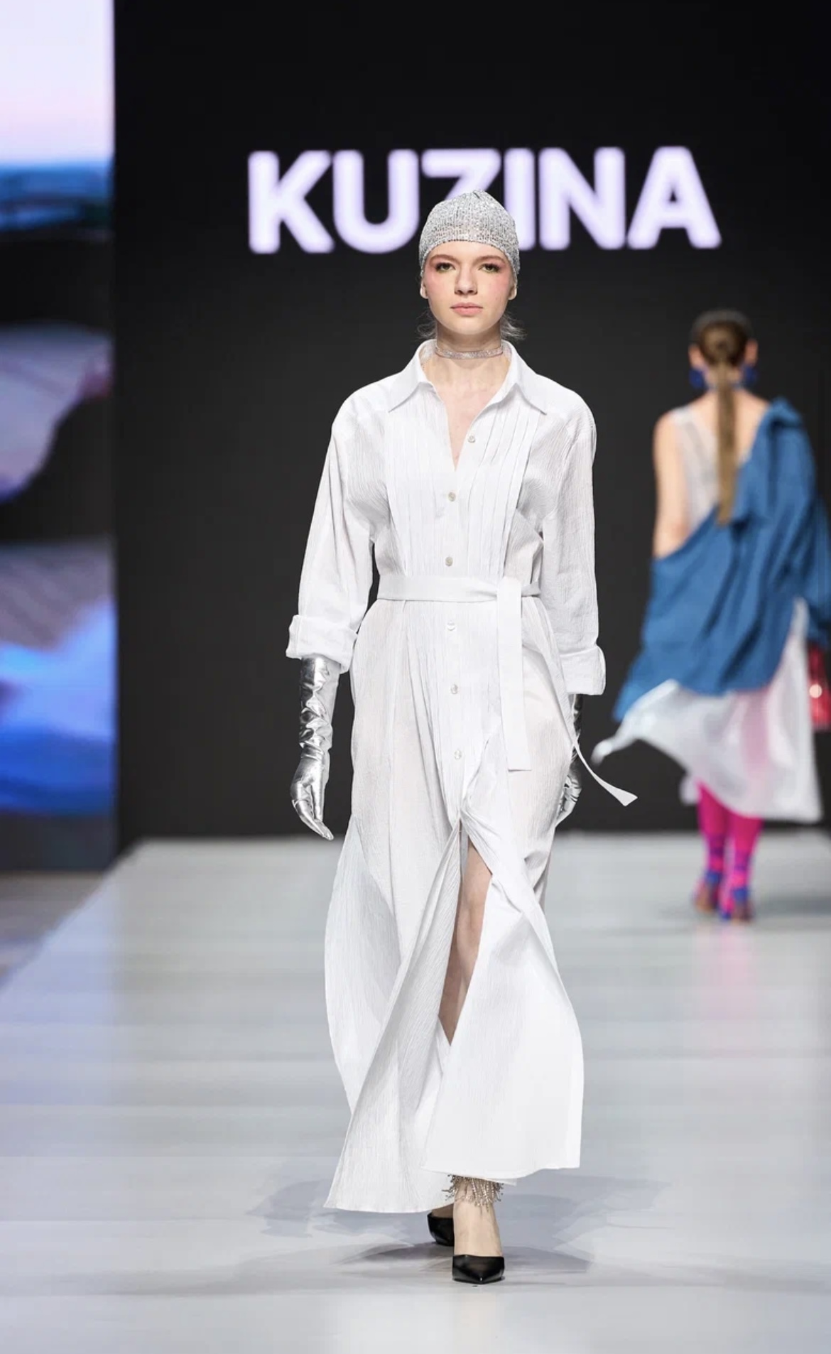 Презентация новой коллекции KUZINA началась с перфоманса поэта Марины Верналис, в творчестве которой дизайнер бренда Ирина Малова нашла вдохновение. Классические силуэты и спокойные оттенки дополнили фактурные материалы, объемные аппликации и крупные аксессуары. Отдельное внимание ульяновский дизайнер уделила акцентам — образы завершали яркие перчатки и гетры, сетка, ажурные колготки и высокие разрезы. В линейку вошли платье-свитер, платье-рубашка, прозрачные комбинации, серия пальто разного кроя, плащи, футболки, брюки, комплекты в пижамном стиле и комплекты со свитерами и юбками в длине миди. Бренд сделал инклюзивный показ и пригласил моделями двух настоящих звезд — КалагинуМартину и Хусаинову Алину, которые по-настоящему сияли на подиуме. Сильные, статные, они представили монохромные наряды со струящимися юбками-макси и комфортными оверсайз-кофтами. Ранее девушки уже покоряли подиум, но перед московской аудиторией они предстали впервые. Уверенность моделей проявилась не только в походке, но и в их огромной жизненной силе. У Алины и Мартины синдром Дауна, но это совершенно не мешает им полностью реализовываться в карьере и достигать больших успехов.