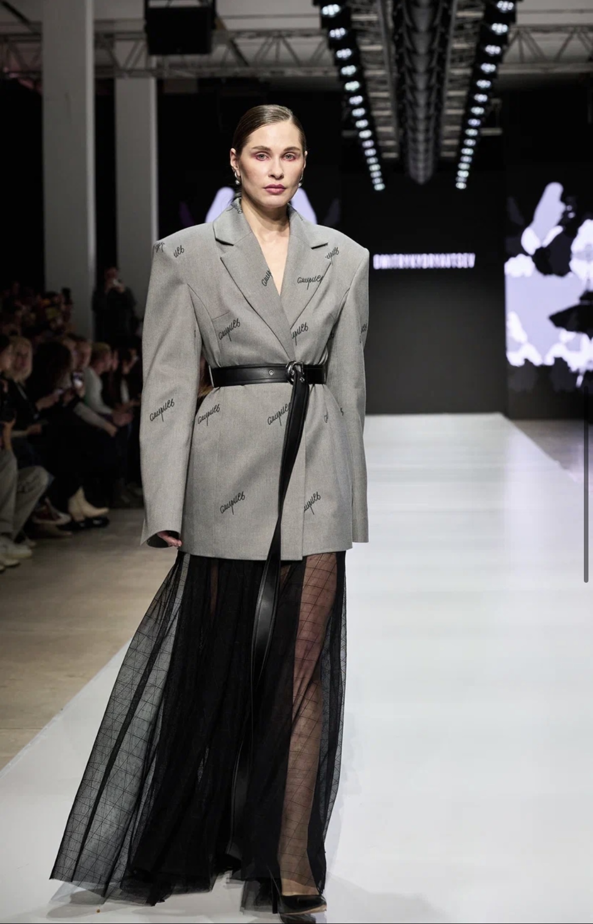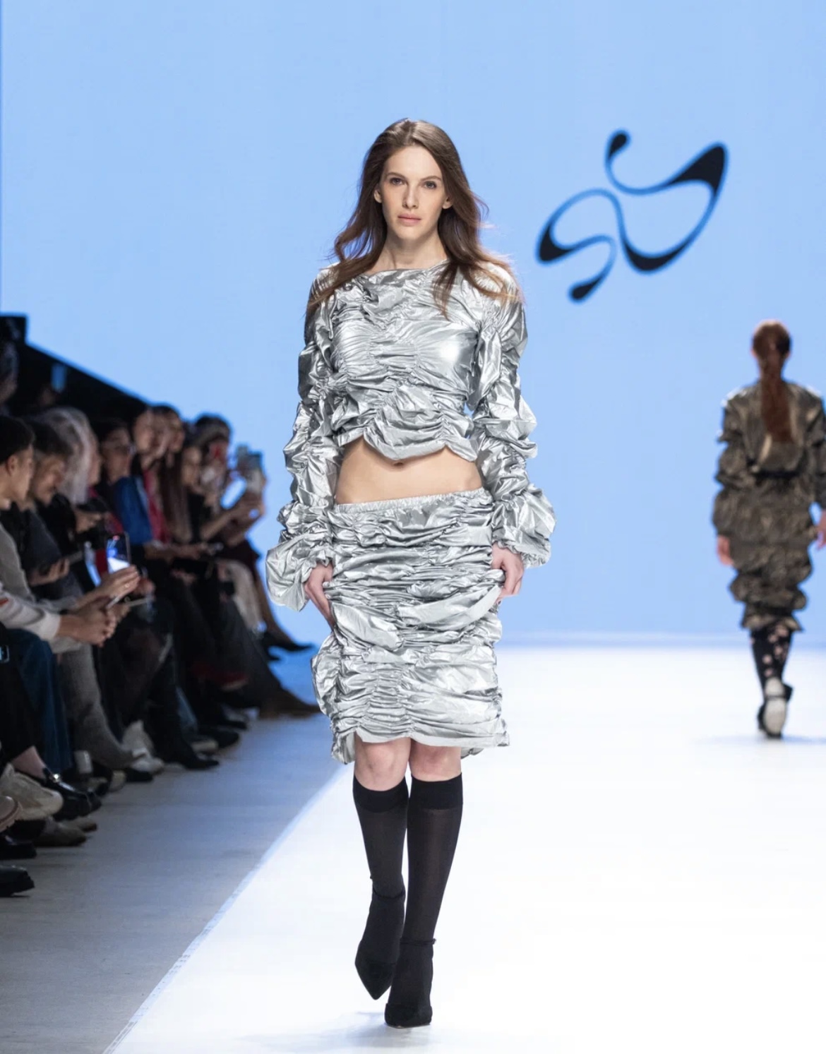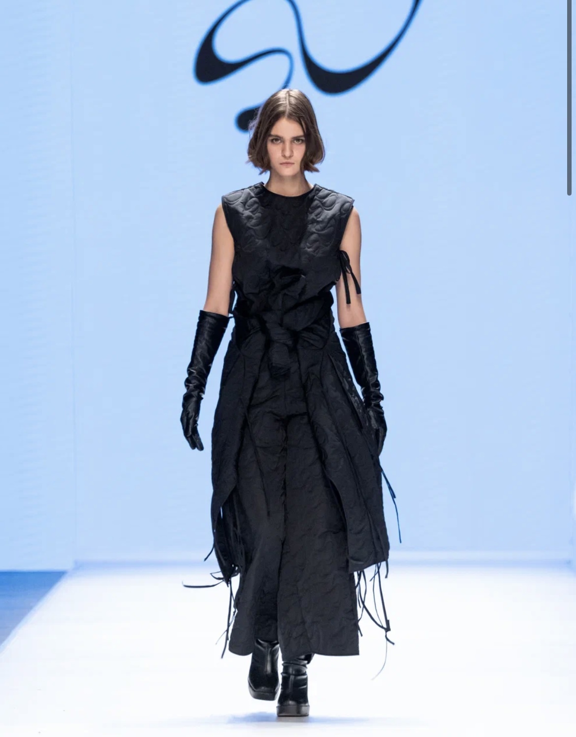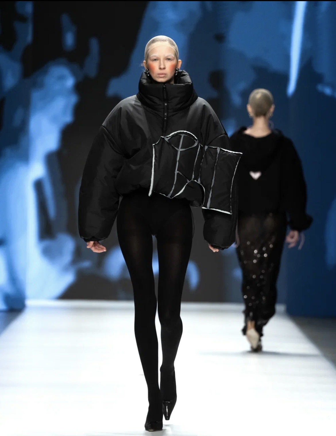 Молодой московский бренд BITTE__RUHE перенес зрителей в путешествие по актуальным трендам — от нежных русалочьих грёз до мрачной средневековой драмы. Первая часть коллекции представляла собой фантазию на тему mermaid core — облегающие платья в пол и брюки-клёш из нежнейших тканей с сияющими пайетками, кружевные микро-платья и макси-сарафаны (всё в популярных оттенках розового кварца и светлой бирюзы), а также белоснежные комплекты с металлизированными элементами. Во второй части коллекции главенствовал чёрный цвет, а силуэты были выстроены на идее соединения несоединимого: драматичные линии плащей и макси-платьев с объемными рукавами вдохновлены историческим кроем, но дополнены спортивными элементами: застежками-молниями и кулисками. Короткий черный пуховик с фрагментом деконструкции – имитацией половинки корсета — усиливал эту идею. В качестве ключевых аксессуаров были использованы облегающие шапочки-сетки из капрона, ставшие недавним хитом и не международных подиумах. Одной из моделей стала известная актриса Елизавета Базыкина, сыгравшая роль медсестры Наташи в нашумевшем сериале «Слово пацана».
