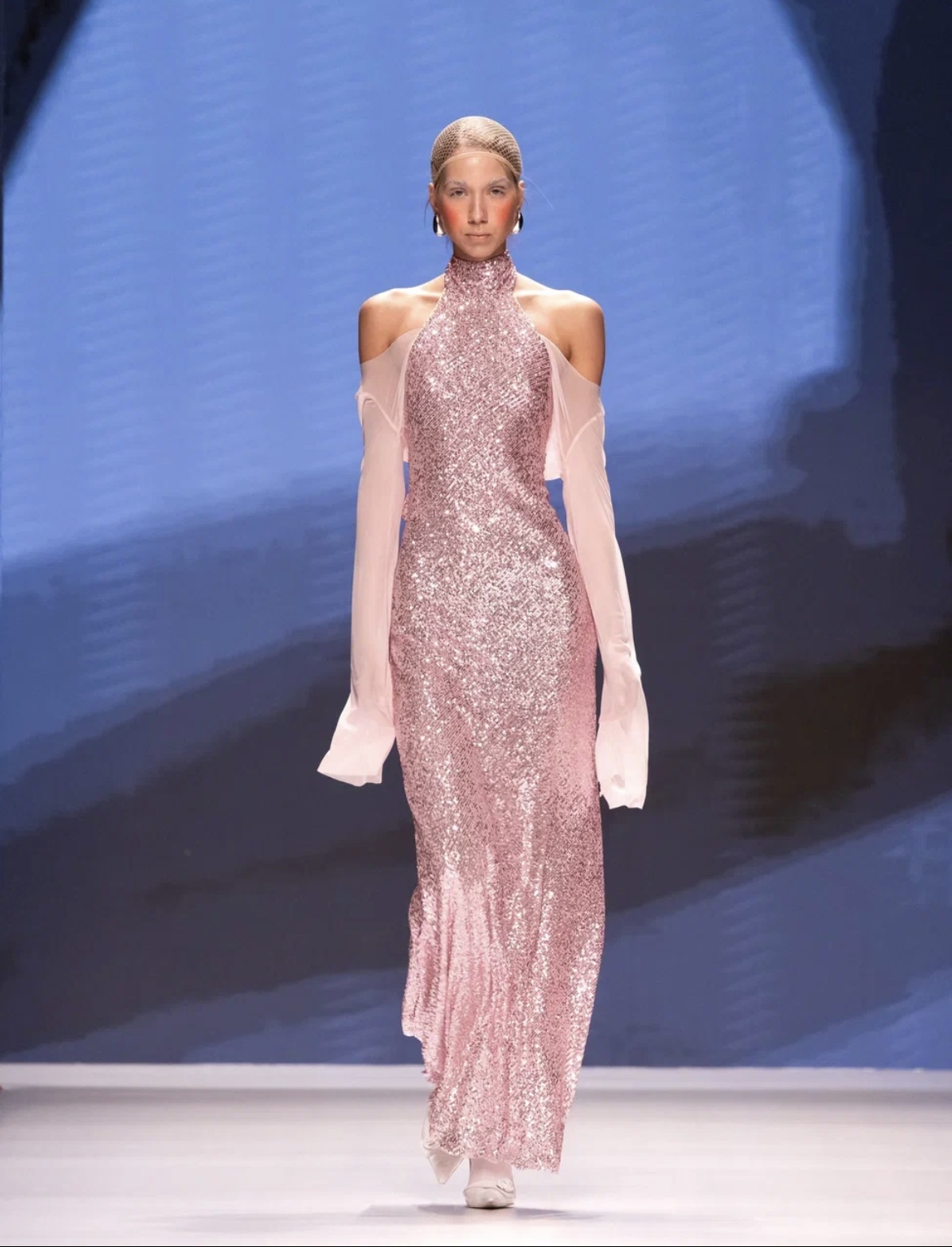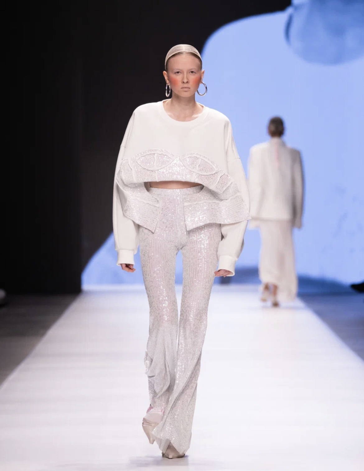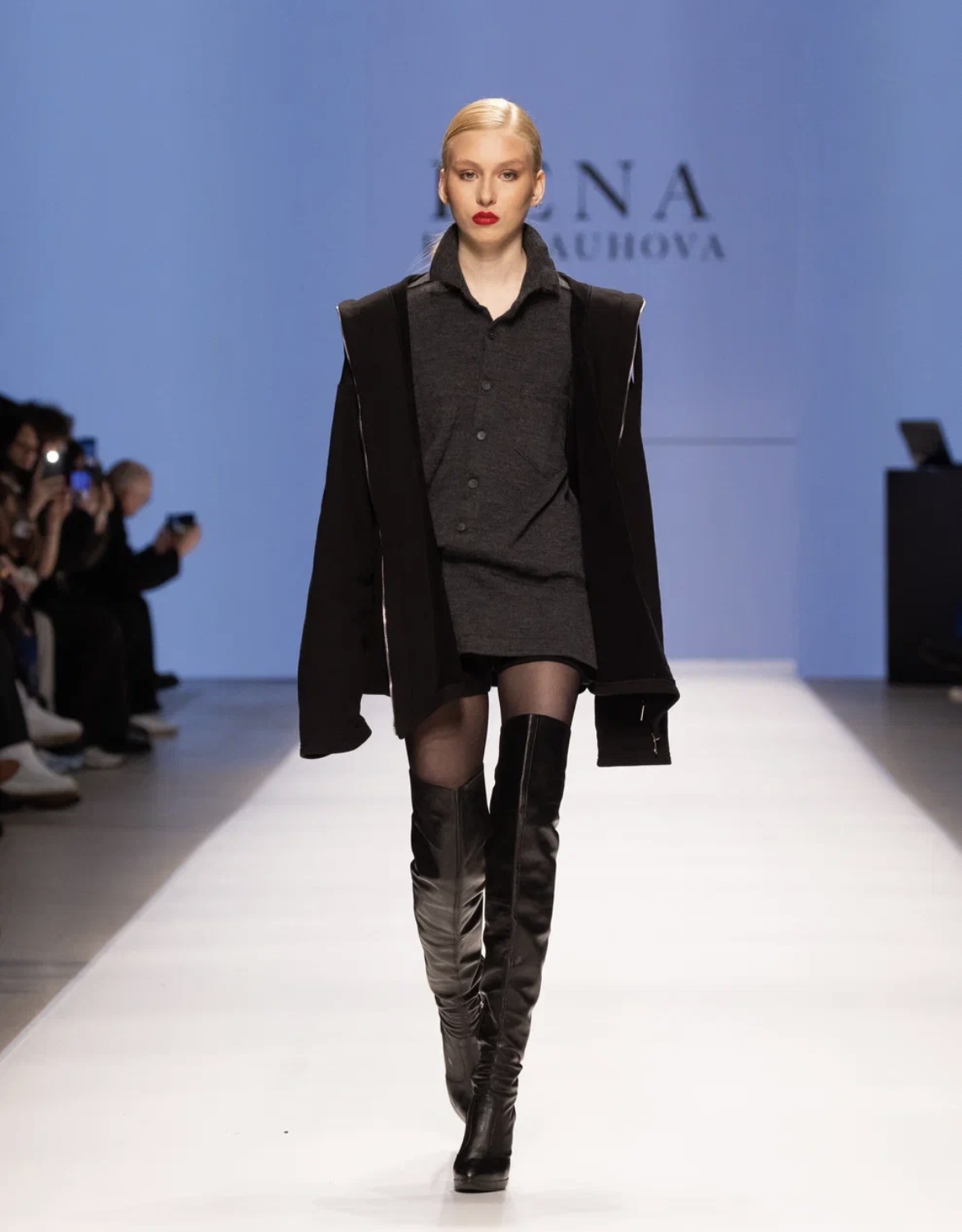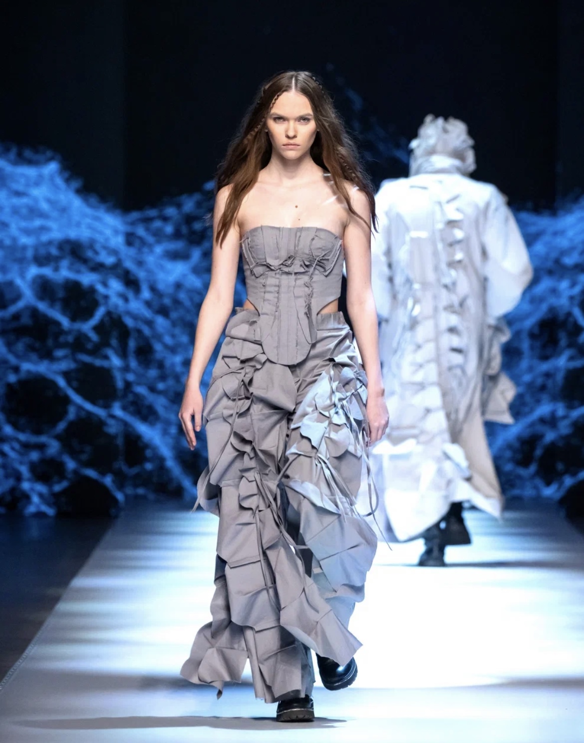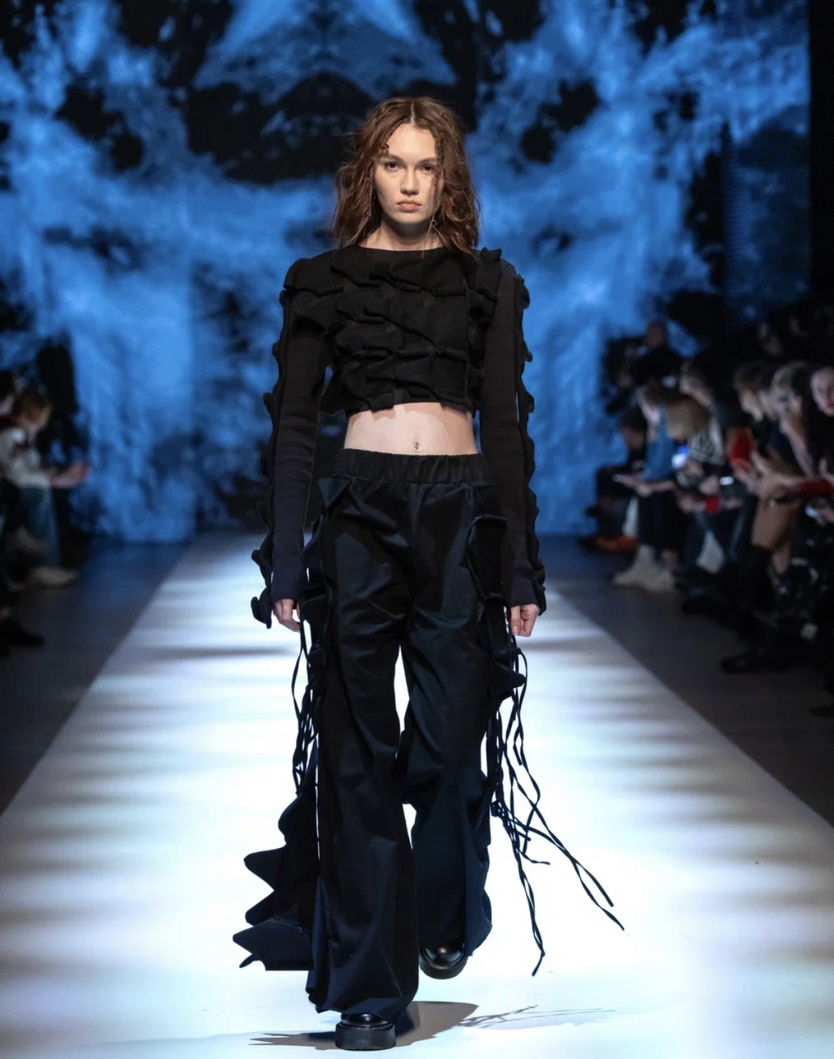 Молодой московский бренд BITTE__RUHE перенес зрителей в путешествие по актуальным трендам — от нежных русалочьих грёз до мрачной средневековой драмы. Первая часть коллекции представляла собой фантазию на тему mermaid core — облегающие платья в пол и брюки-клёш из нежнейших тканей с сияющими пайетками, кружевные микро-платья и макси-сарафаны (всё в популярных оттенках розового кварца и светлой бирюзы), а также белоснежные комплекты с металлизированными элементами. Во второй части коллекции главенствовал чёрный цвет, а силуэты были выстроены на идее соединения несоединимого: драматичные линии плащей и макси-платьев с объемными рукавами вдохновлены историческим кроем, но дополнены спортивными элементами: застежками-молниями и кулисками. Короткий черный пуховик с фрагментом деконструкции – имитацией половинки корсета — усиливал эту идею. В качестве ключевых аксессуаров были использованы облегающие шапочки-сетки из капрона, ставшие недавним хитом и не международных подиумах. Одной из моделей стала известная актриса Елизавета Базыкина, сыгравшая роль медсестры Наташи в нашумевшем сериале «Слово пацана».