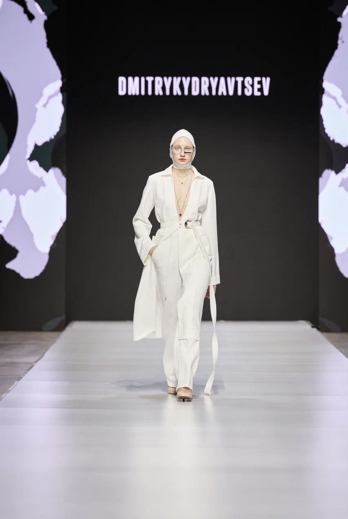 Главным эмоциональным источником коллекции DmitryKudryavtsev стал тест Роршаха — как идея того, что разные люди при взгляде на одну и ту же картинку могут увидеть в ней что-то совершенно разное. Отдельные вещи были оформлены абстрактными принтами, но главным в показе стал всё-таки силуэт — лаконичный, вытянутый, усиливающий линии женской фигуры. Основная палитра коллекции, включающая черный, красный, белый и серебряный, тоже не отвлекала внимания от формы и усиливала драматический эффект. На подиуме были представлены скульптурные платья-жакеты с элементами деконструкции, брюки с высокими разрезами, «нагие» топы, украшенные сияющей бахромой, макси-платья с неожиданными вырезами и платья из металлизированных тканей, дополненные контрастными бархатными лентами, завязывающимися на спинке.