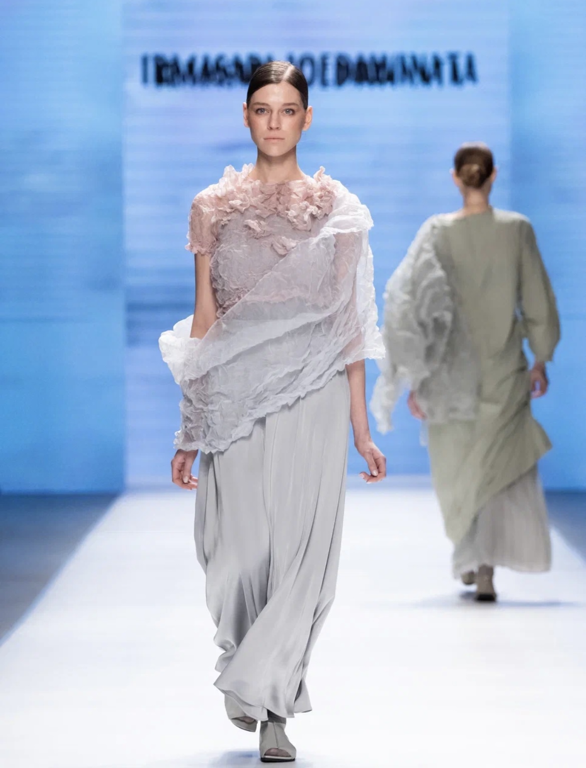 Бренд из Индонезии IRMASARI JOEDAWINATA привез с собой атмосферу далекого и туманного океанического побережья, которое открывалось воображению благодаря плавным линиям силуэтов и прозрачным материалам, многократно наслаивающимся друг на друга. Настроение соленой воды и воздуха поддерживалось нежной природной палитрой, в которой преобладали оттенки розового мела, серого песка, прибрежных камней, морской синевы и тропической зелени. Коллекция оставляла ощущение свободы и лёгкости, несмотря на многослойность: силуэты-коконы, окутывающие фигуры моделей, дополнялись воздушными шарфами из жатого шёлка; тот же жатый шёлк присутствовал в качестве основной фактуры топов и платьев, напоминающих то морскую пену, то цветущий сад. В качестве дополнений были использованы длинные фактурные перчатки и крупные украшения.