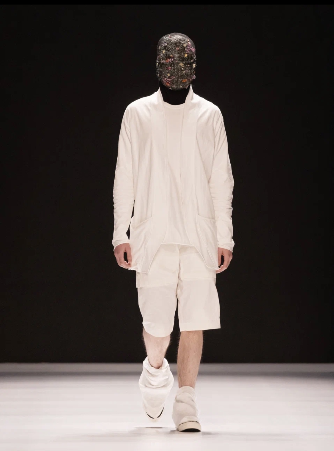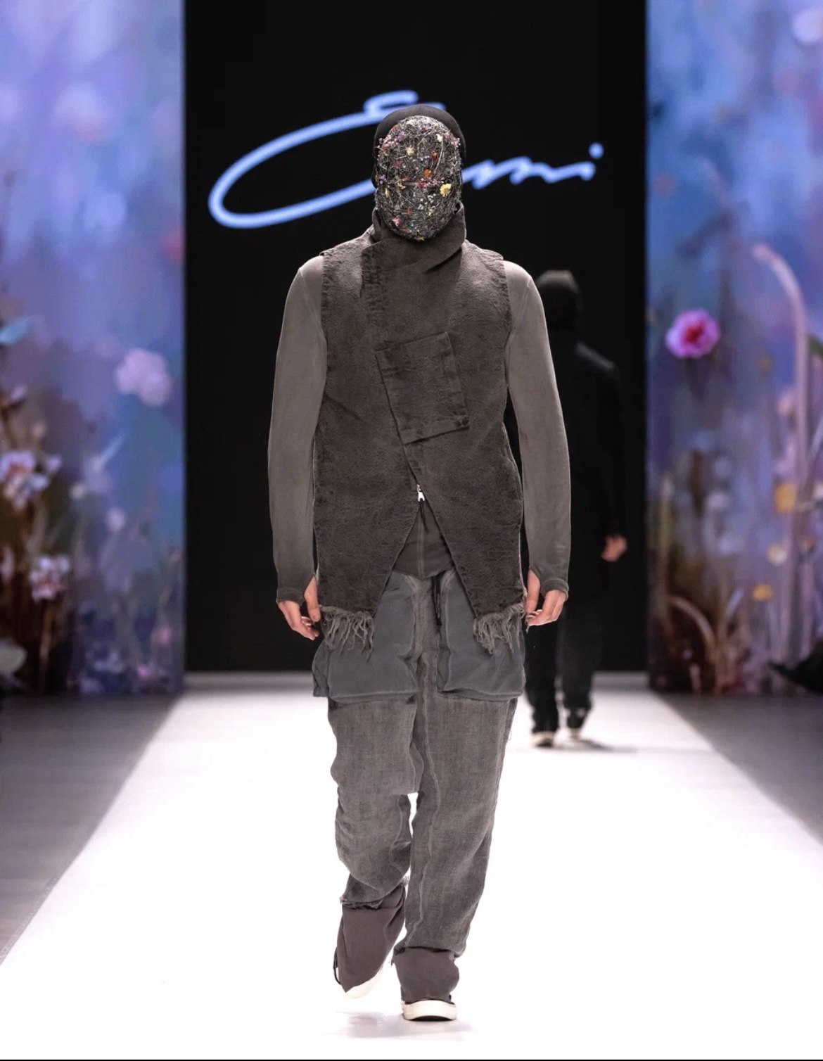 Концепция новой коллекции бренда заключается в перипетиях времен. Идея обрела свое воплощение в элементах старинных костюмов XVIII-XX веков, которые дизайнер внедрил в новую линейку Ermi. При создании представленных моделей использовалась комбинация современных материалов и старинных полотен из крапивы, льна и дикого шелка. Чтобы передать дух времени, все изделия были состарены вручную с использованием уникальной техники. На подиуме были представлены мужские комплекты, верх которых составили толстовки, рубашки и пиджаки с нейлоновыми вставками, а низ был завершен брюками, преимущественно в тон верху, и шортами с необработанными краями и накладными карманами.