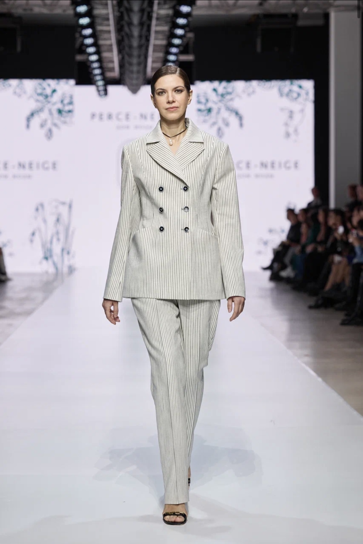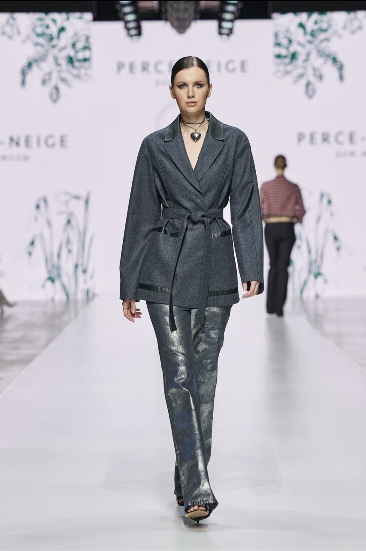 Московский бренд Perce-Neige представил коллекцию, в которой образ lady like встретился с интеллектуальным шиком, а выверенная элегантность — с повседневной практичностью. Зрителям продемонстрировали объемный женский гардероб, разработанный для поклонниц классического, но изящного стиля для самых разных жизненных ситуаций. Эпицентром коллекции стали женственные силуэты с подчеркнутой талией и аккуратным прилеганием по фигуре, струящиеся юбки-миди, в том числе плиссированные, а также платья, жакеты и пальто универсальных оттенков кофейного, бежевого, серебристо-серого, жемчужного. Брючные костюмы были пошиты как в строгом чёрном цвете, так и в мягких оттенках красного. Подкладки платьев и верхней одежды выполнены из натурального шёлка. Отделка некоторых вещей — например, твидовых костюмов и топов с круглой горловиной — выполнена вручную и напоминает винтажные украшения.
