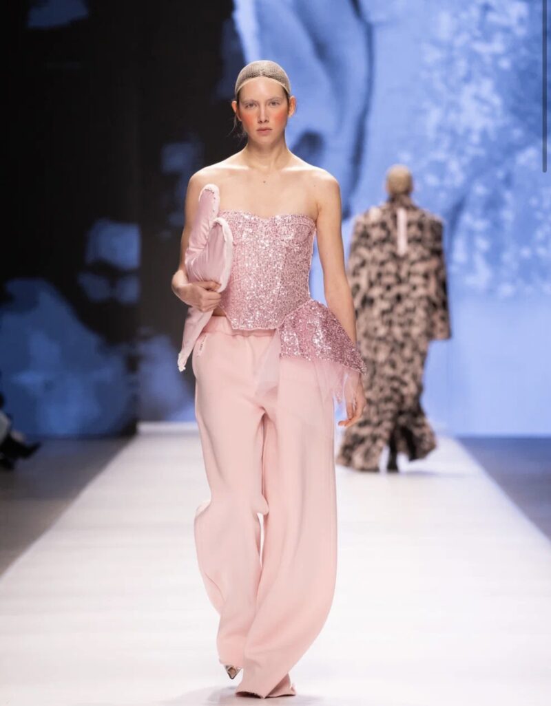 Молодой московский бренд BITTE__RUHE перенес зрителей в путешествие по актуальным трендам — от нежных русалочьих грёз до мрачной средневековой драмы. Первая часть коллекции представляла собой фантазию на тему mermaid core — облегающие платья в пол и брюки-клёш из нежнейших тканей с сияющими пайетками, кружевные микро-платья и макси-сарафаны (всё в популярных оттенках розового кварца и светлой бирюзы), а также белоснежные комплекты с металлизированными элементами. Во второй части коллекции главенствовал чёрный цвет, а силуэты были выстроены на идее соединения несоединимого: драматичные линии плащей и макси-платьев с объемными рукавами вдохновлены историческим кроем, но дополнены спортивными элементами: застежками-молниями и кулисками. Короткий черный пуховик с фрагментом деконструкции – имитацией половинки корсета — усиливал эту идею. В качестве ключевых аксессуаров были использованы облегающие шапочки-сетки из капрона, ставшие недавним хитом и не международных подиумах. Одной из моделей стала известная актриса Елизавета Базыкина, сыгравшая роль медсестры Наташи в нашумевшем сериале «Слово пацана».