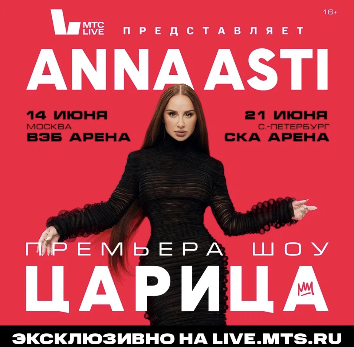 ANNA ASTI и МТС Live объявляют о начале работы над новым шоу «Царица», премьера которого состоится в 2025 году. 14 июня на ВЭБ Арене в Москве и 21 июня на СКА Арене в Санкт-Петербурге певица и её команда представят поклонникам шоу, которое впечатлит своими масштабами и зрелищностью.