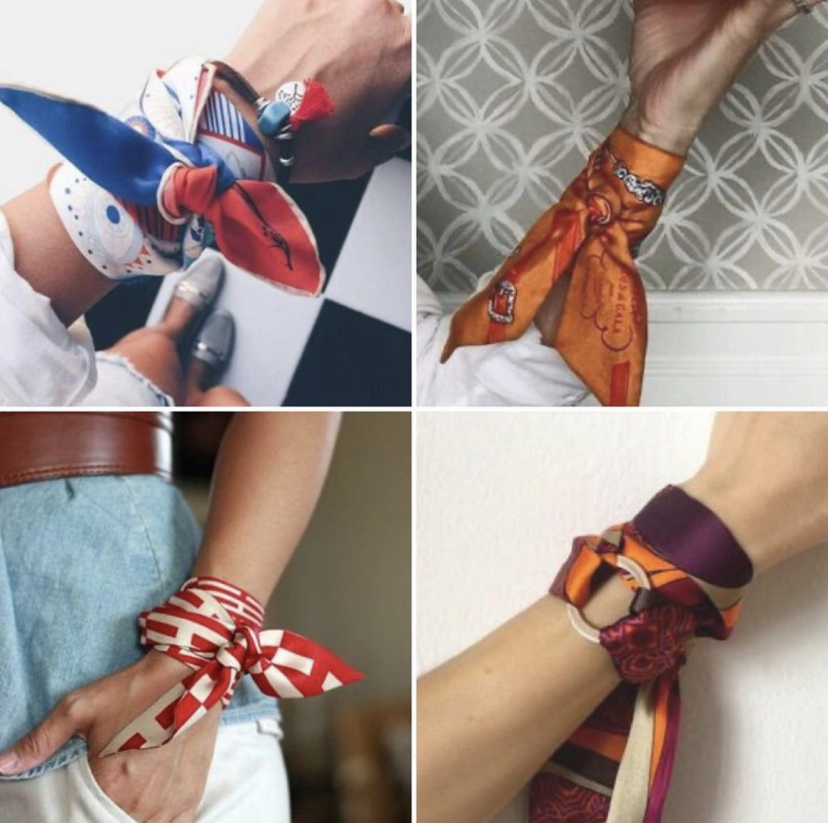 Платок twilly, представляет собой очень узкий шелковый шарф, визуально напоминающий ленту. Секрет популярности twilly- он может использоваться в качестве браслета, шарфа, ленты для волос, украшения на шляпу, украшения щиколотки и на босоножки, на ручку сумки, на брелок, вместо ремешка для часов, в качестве ободка, можно повязать на шею самостоятельно, а также замиксовать с цепями или ниткой жемчуга, интересно будет также повязать ленту на лямку сарафана или платья комбинации.