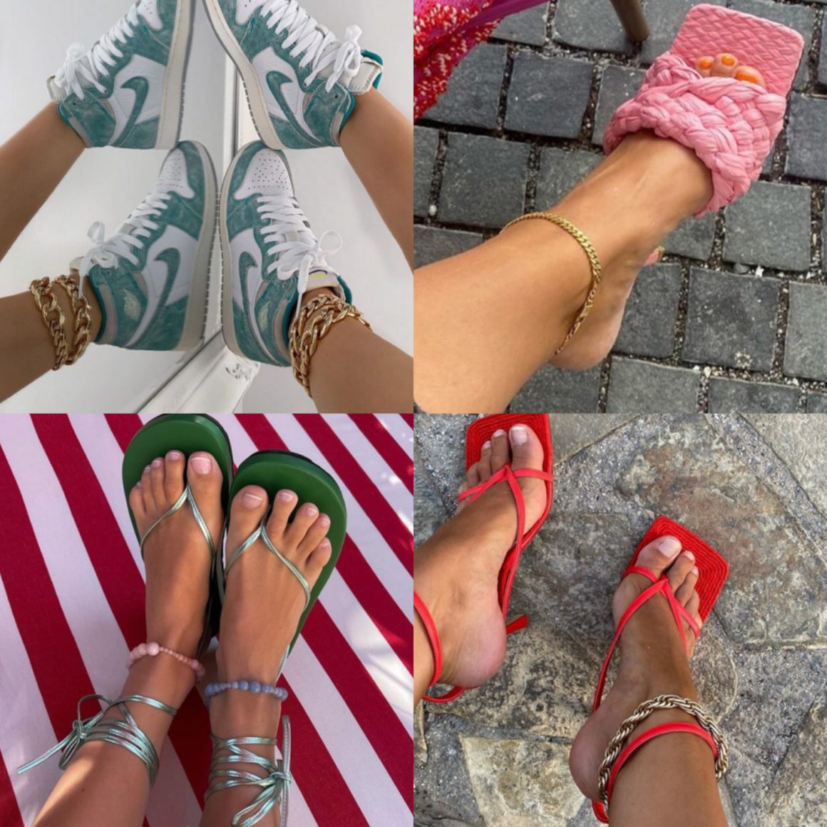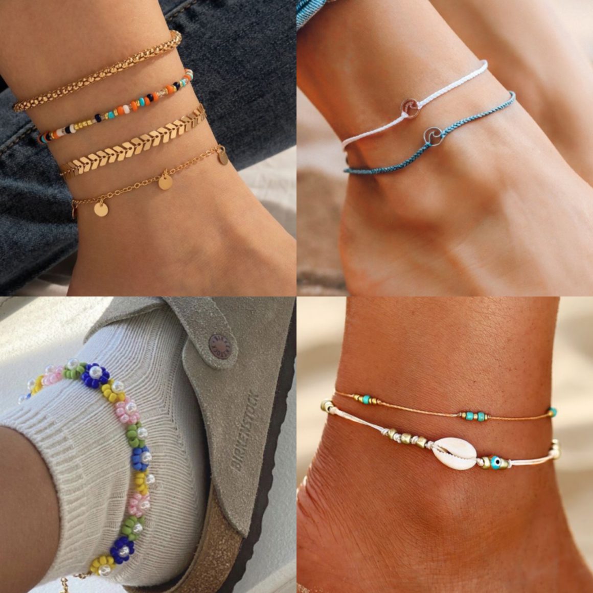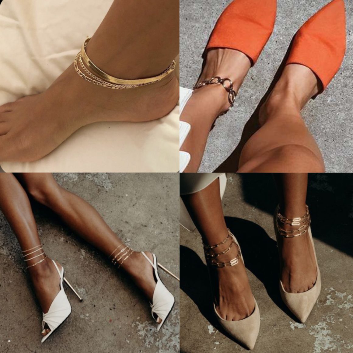 Для повседневной жизни и с любым стилем подойдет тонкая цепочка в белом или желтом металле (можно соединить две цепочки и двух разных цветов). Для летних и городских образов, подойдет цепочка среднего размера, можно украсить обе щиколотки, для пляжа и отпуска, можно выбрать цветные анклеты с ракушками, жемчугом, бисером или с мелкими кристаллами.