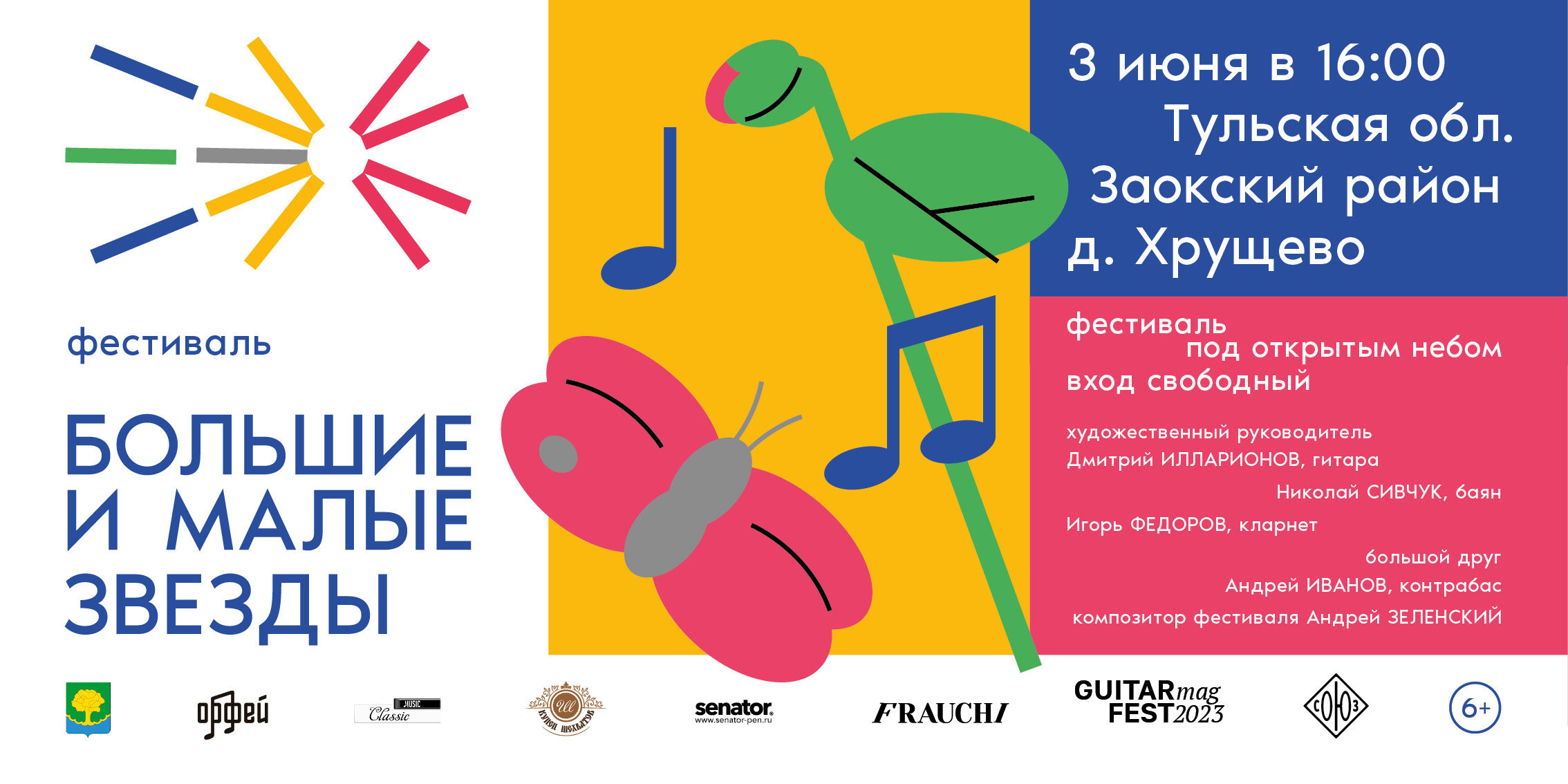 3 июня в деревне Хрущево Заокского района Тульской области пройдет гала-концерт Пятого музыкального фестиваля под открытым небом «Большие и малые звезды». На сцену, устроенную на фоне природы, поднимутся известный гитарист, обладатель гран-при крупнейшего конкурса классической гитары GuitarFoundation of America и номинант лонг-листа премии Grammy Дмитрий Илларионов, обладатель «Кубка мира» в номинации «академический баян» Николай Сивчук, признанный виртуоз – кларнетист Игорь Федоров, а также большие друзья фестиваля, заслуженный артист России контрабасист Андрей Иванов и яркий и виртуозный альтист Максим Новиков. Вместе с Большими Звездами выступят учащиеся детских музыкальных школ Тулы, Калуги, Москвы и других городов России.