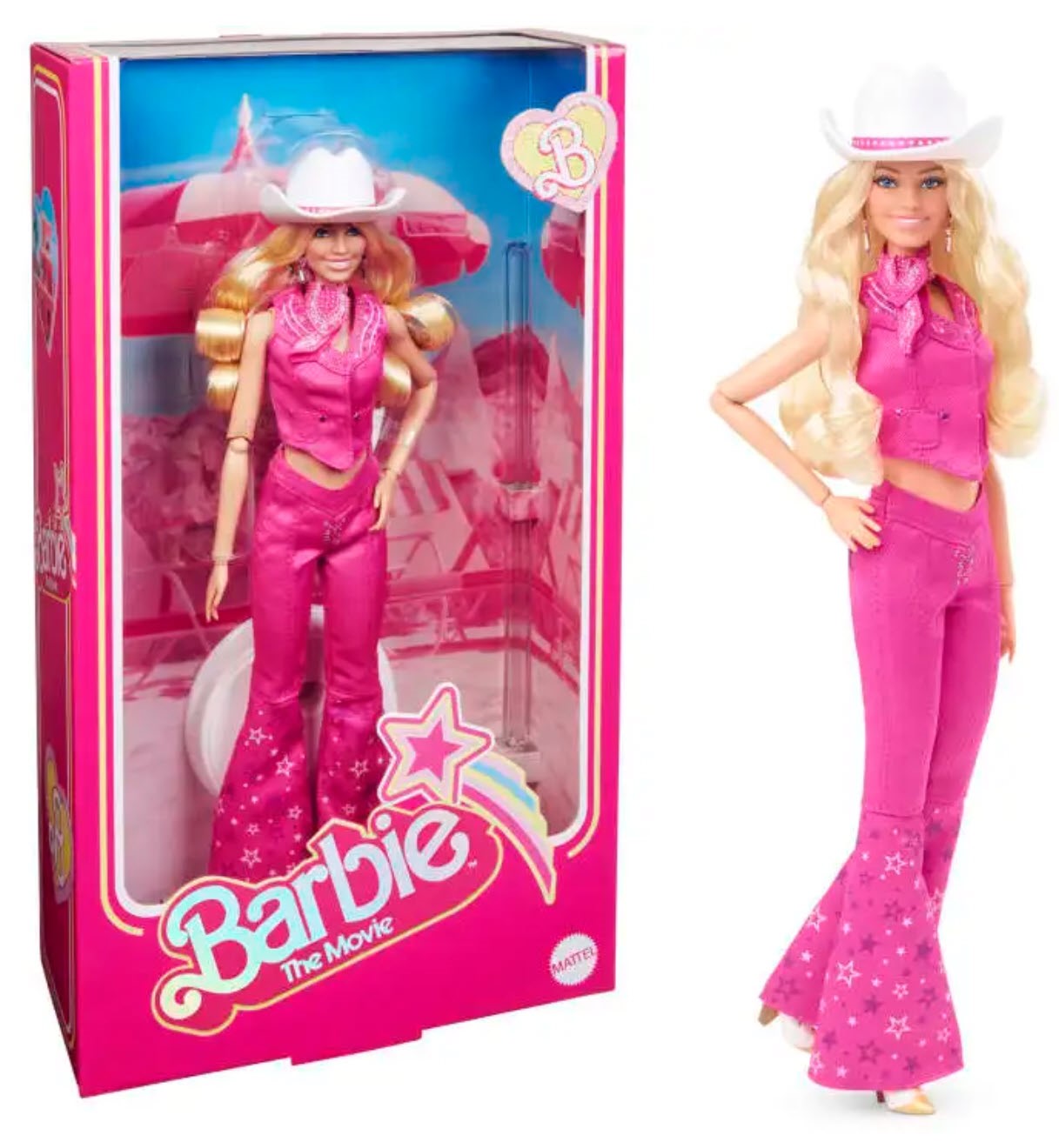 Розовая машина с откидным верхом, розовые наряды в ковбойской эстетике, розовые платья и костюмы из атласной блестящей ткани в точности напоминают образы Марго Робби!