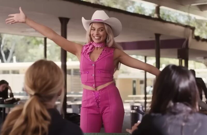 Розовая машина с откидным верхом, розовые наряды в ковбойской эстетике, розовые платья и костюмы из атласной блестящей ткани в точности напоминают образы Марго Робби!
