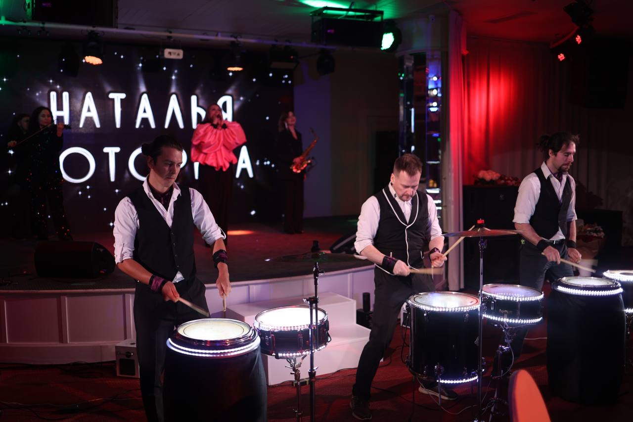 Концерт стартовал с завораживающего видеомикса хитов Натальи, после чего на сцену ворвалось огненное шоу барабанщиков, зарядив зал энергией ритма.