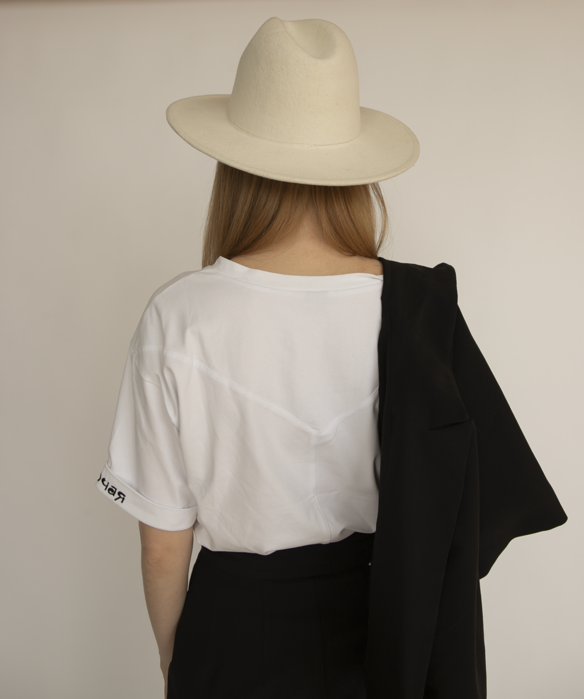 Сейчас в коллекции представлены футболки и юбки для девушек, мужские футболки. Есть базовая, чистая серия, а есть уникальная — футболки с текстовой вышивкой.