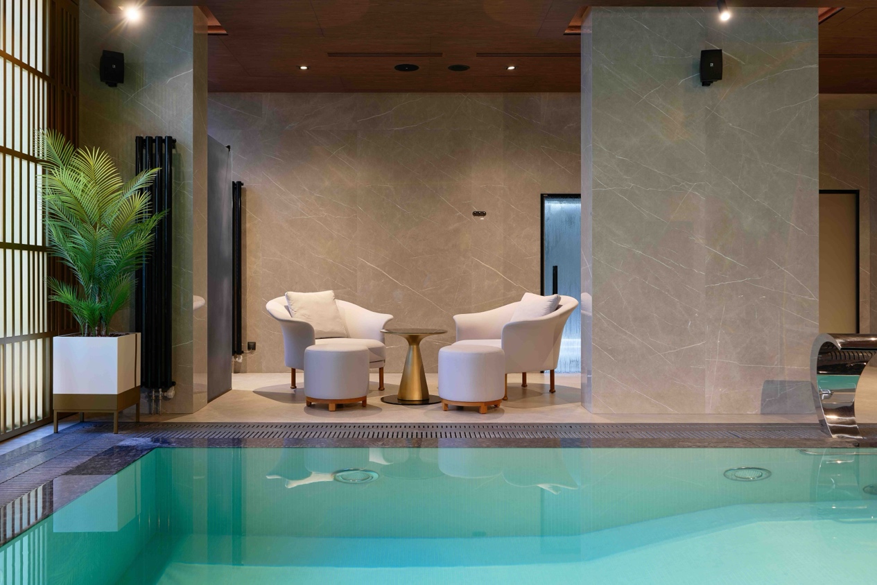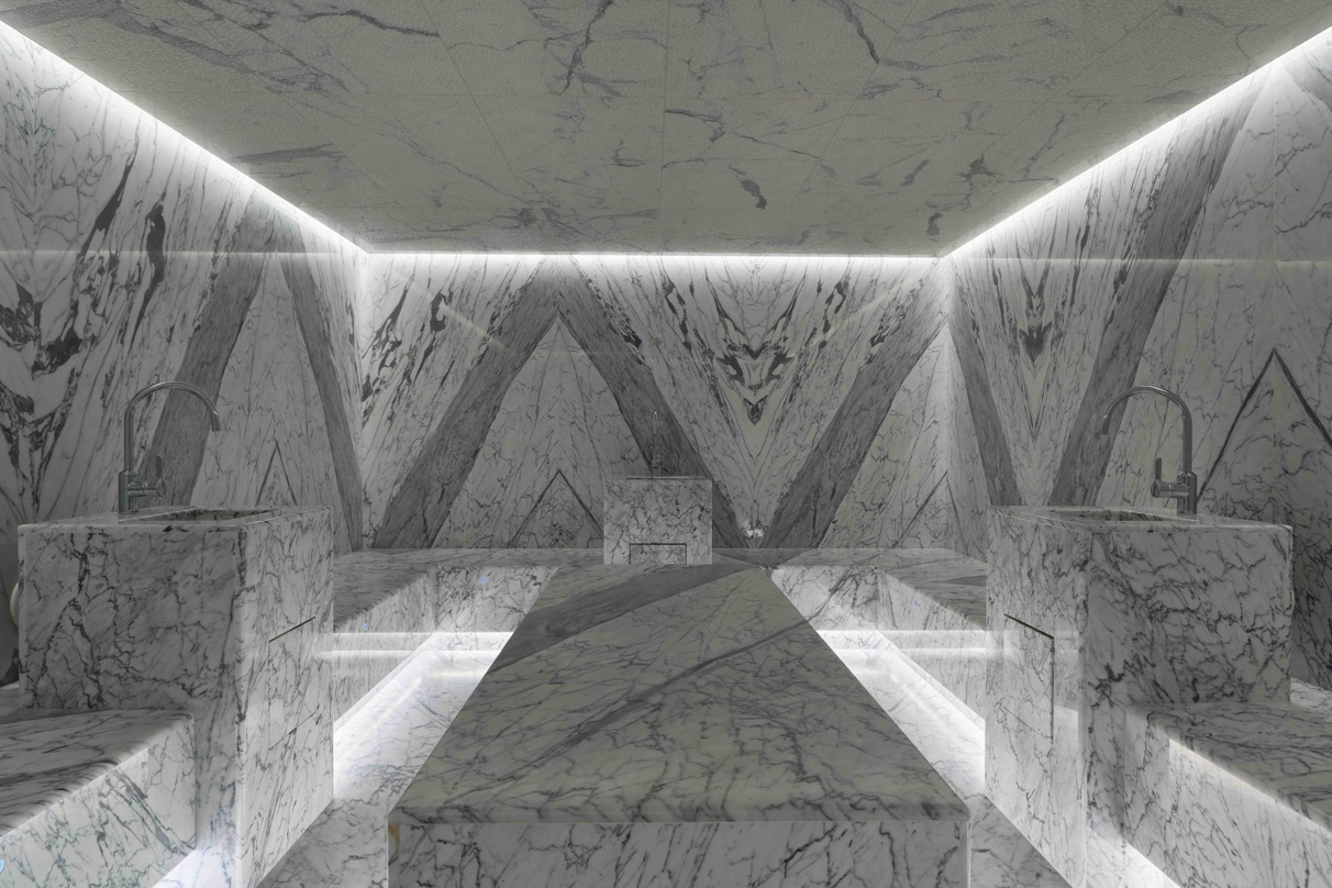 Фитнес- и спа-зона оформлены в современном стиле. В отделке стен используются крупноформатная плитка, натуральное дерево, латунь и мрамор. Потолки облицованы дубовым шпоном, а окна дополнены подвижными латунными ставнями.