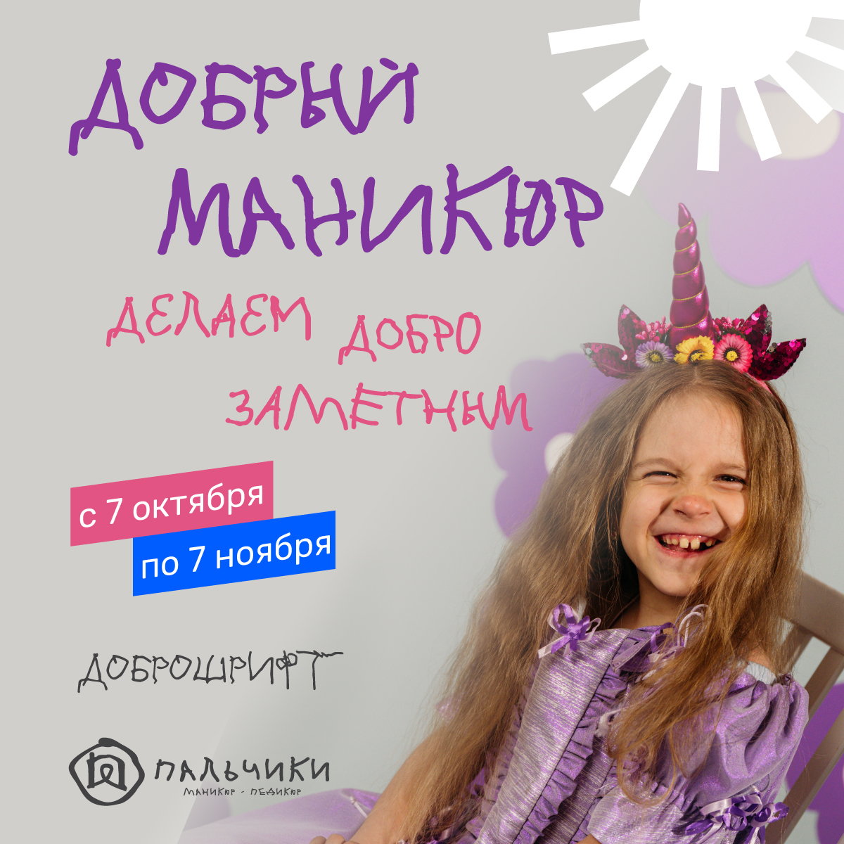 В этом году сеть «Пальчики» не только вновь меняетлоготип на сайте и в социальных сетях, который был разработан с помощью специального шрифта, но, как и в прошлом году, снова запускает акцию «Добрый маникюр» — она позволит всем гостям сети принять участие в сборе средств для подопечных проекта «Доброшрифт». С 7октября по 7 ноября каждый гость сможет добавить к любой услуге «Добрые 50 рублей» и получить специальный стикер из стикерпака.  Все собранные средства будут направлены в фонд, чтобы помочь детям, которым требуются забота и внимание проекта «Доброшрифт».
