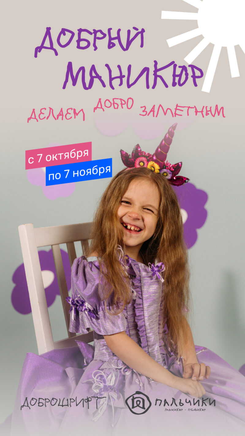 За 6 лет Доброшрифт уже помог более 10 000 детей, а неровные буквы стали символом солидарности, объединив бренды, людей и инфлюенсеров. В этом месяце в знак поддержки сеть салонов «Пальчики» поменяли свою привычную коммуникацию на Доброшрифт и приглашаетвас тоже поддержать проект.