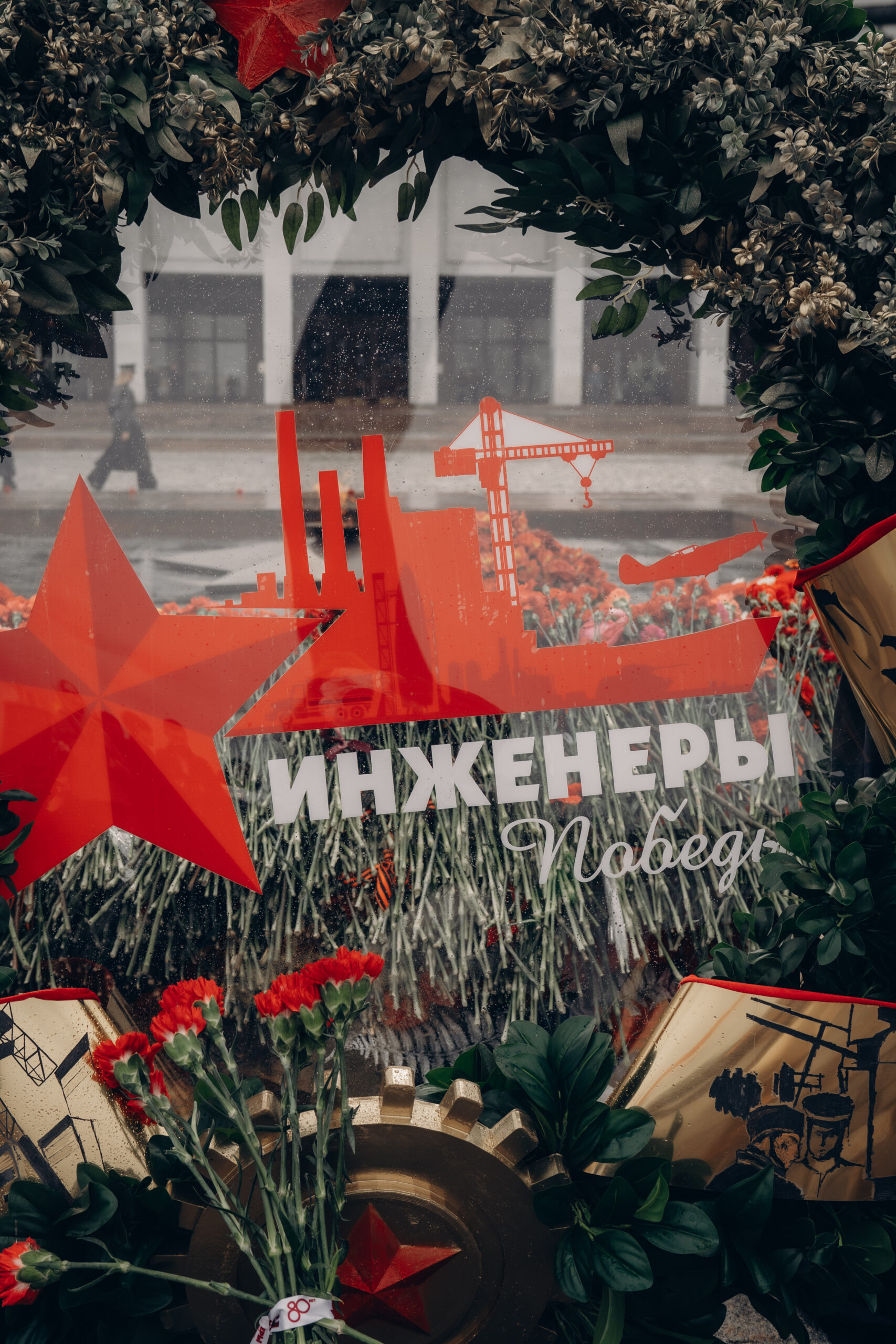 Особое внимание привлекли ленты венка с изображениями инженеров времен Великой Отечественной войны. Гравировка выполнена вручную с использованием трафаретов на основе исторических плакатов советского времени. В оформлении использованы три вида зелени разных оттенков — от светло-зеленого самшита до темно-зеленых цитрусовых листьев.