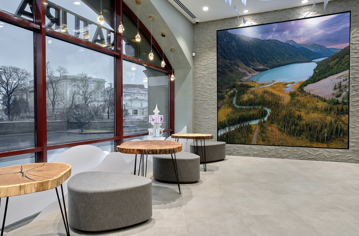 Путешествие по Сибири и Дальнему Востоку начнётся сразу, как только Вы перешагнёте порог нового магазина Natura Siberica. Сперва Вы соприкоснётесь со стихией Огня, ощутив огненное дыхание неспящих вулканов и древних подземных сил. Оглянувшись, Вы заметите, как огненные всполохи самого высокого и активного вулкана Камчатки – Ключевой сопки – перепрыгнули на каменную колонну, оставляя на своём пути огненные картины наскальной живописи. Но природа ценит равновесие, и на пути Огня встаёт стихия Воды, бурною рекою несущаяся по потолку в формате световой инсталляции. Стихия Земли воплотилась в живых растениях, произрастающих на территории всего магазина, а стихия Воздуха – в светлом помещении, полным воздуха и свободного пространства.