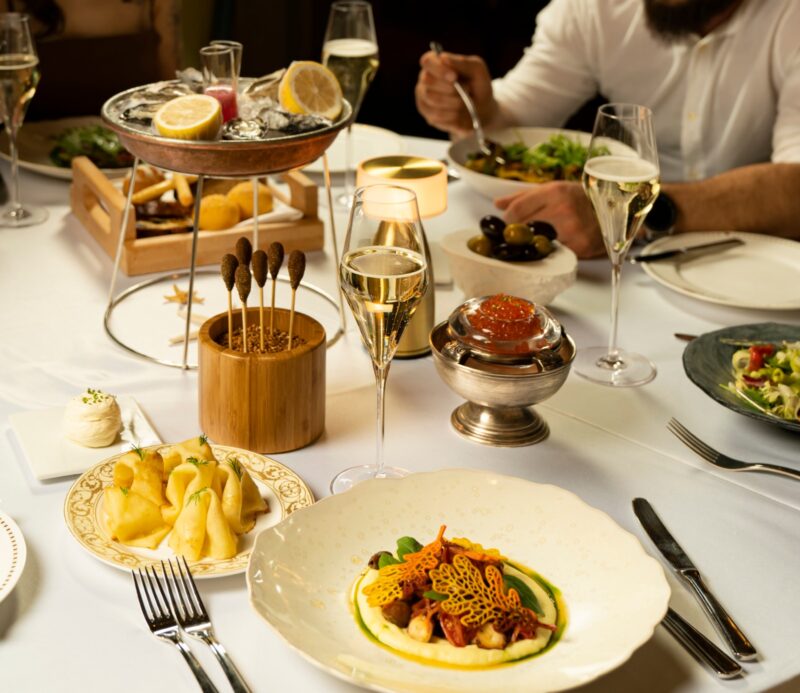 Кухня именитого бренд-шефа Ильи Захарова Ильи Захарова умело сочетает в себе тонкие мотивы локальных блюд, паназиатских акцентов и европейской классики. Основу меню составляют инновационные блюда из рыбы, морепродуктов и мяса. Следуя строгим законам высокой гастрономии, все — от мясных закусок и выпечки до соусов и мороженого готовится в ресторане. При создании блюд бренд-шеф использует локальные продукты, в том числе горные травы. А живые морские деликатесы доставляют в ресторанный аквариум из Японии и Дальнего Востока.