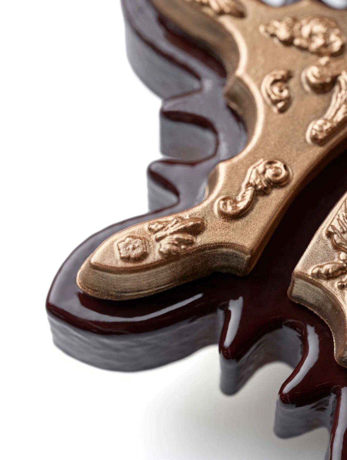 Венчает десерт «Звезда Габриэль» декоративная шоколадная плитка, вид которой напоминаеттекстуру и золотой цвет Кордовской кожи, украшающей стены ресторанного зала. Во вкусе шоколадного украшения угадываются пралине и Флёр де сель. На нем также присутствует едва заметная печать ресторана La Gabriel. Эту шоколадную плитку лучше всего попробовать отдельно от десерта, вместе с кофе.